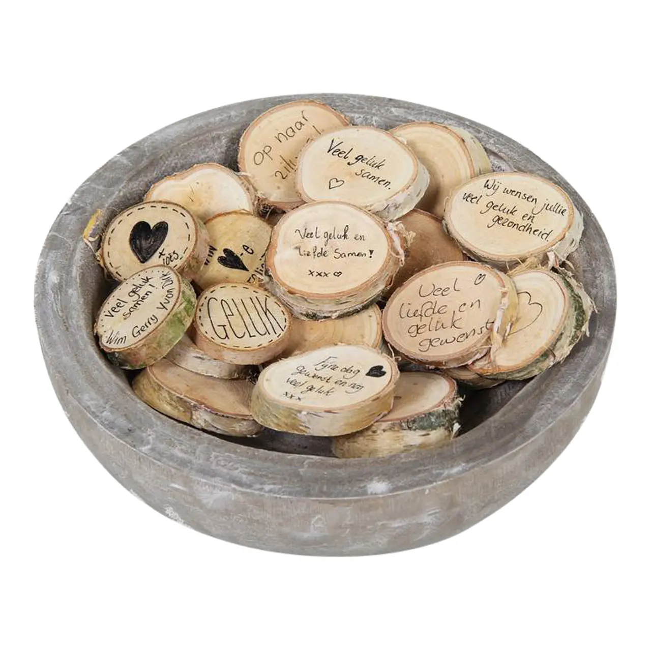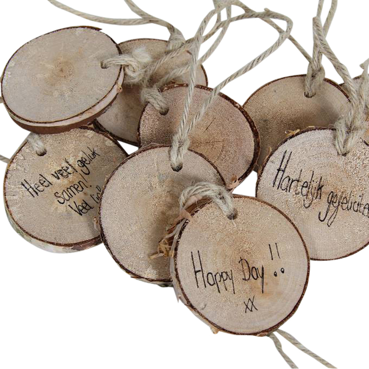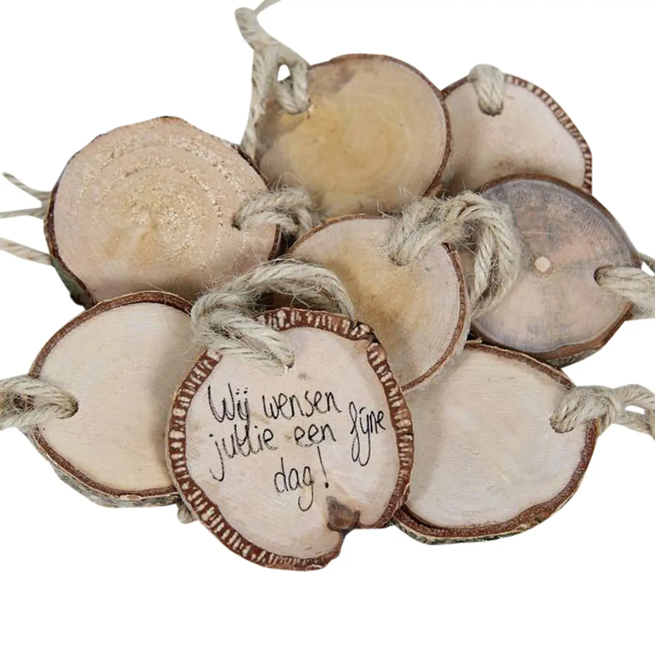 Set aus 5 Wunschscheiben aus Birke mit einem Durchmesser von ca. 6-8 cm, komplett mit einem robusten Juteseil zum Aufhängen. Ideal zum Schreiben, Malen oder Dekorieren und anschließendem Aufhängen.