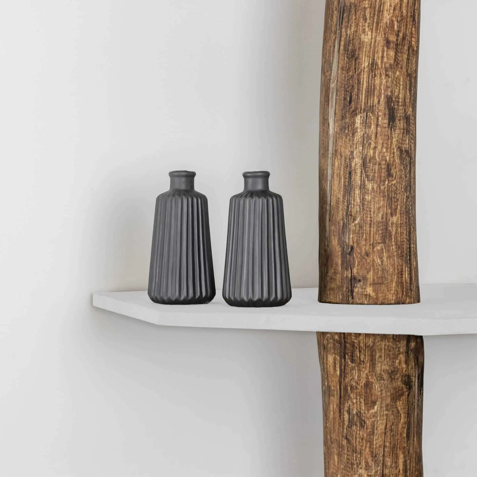 Alrik Baumstamm-Eckschrank mit natürlichem Baumstamm, der mit Eichenöl behandelt wurde, und 4 weißen Eckregalen.
