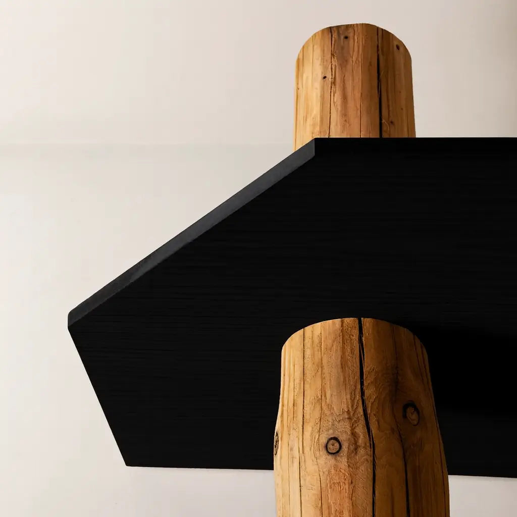 Kiran Baumstamm-Eckschrank mit natürlichem Baumstamm, behandelt mit einem Old Naturel-Öl und 4 schwarzen Eckregalen.