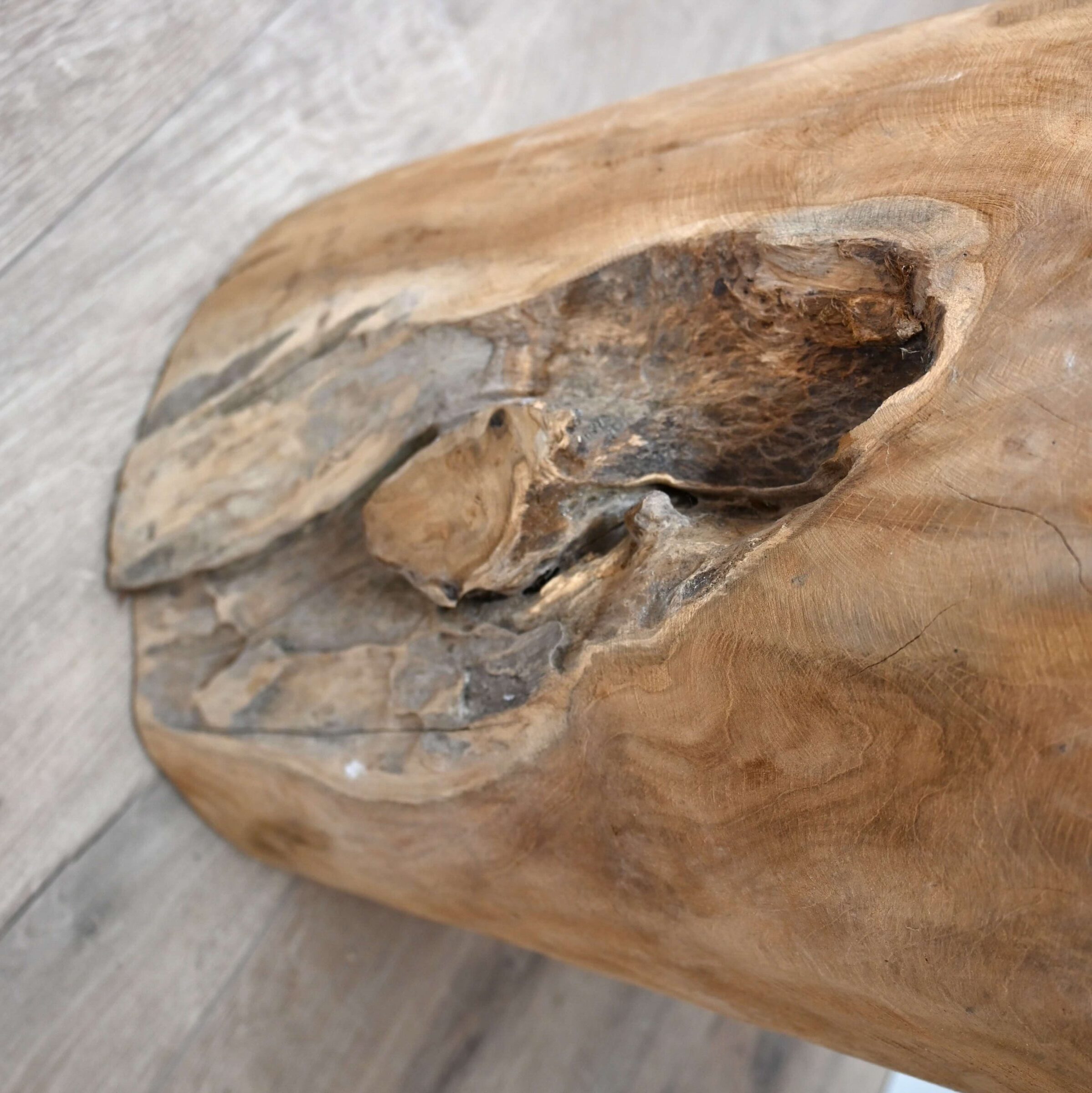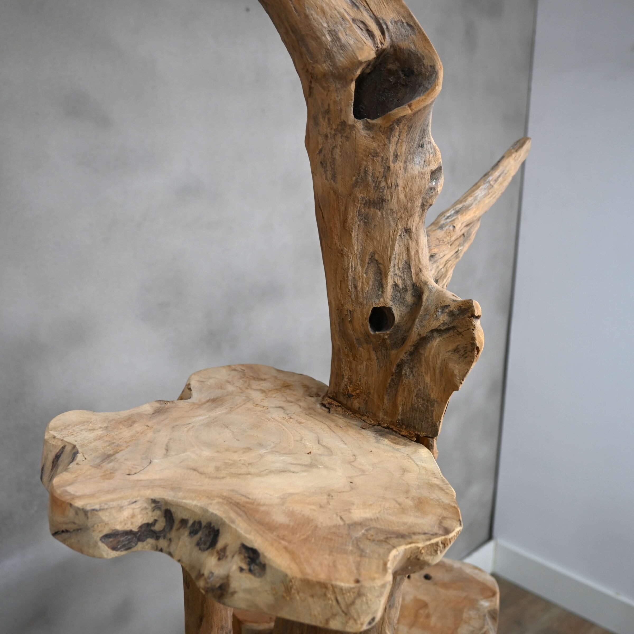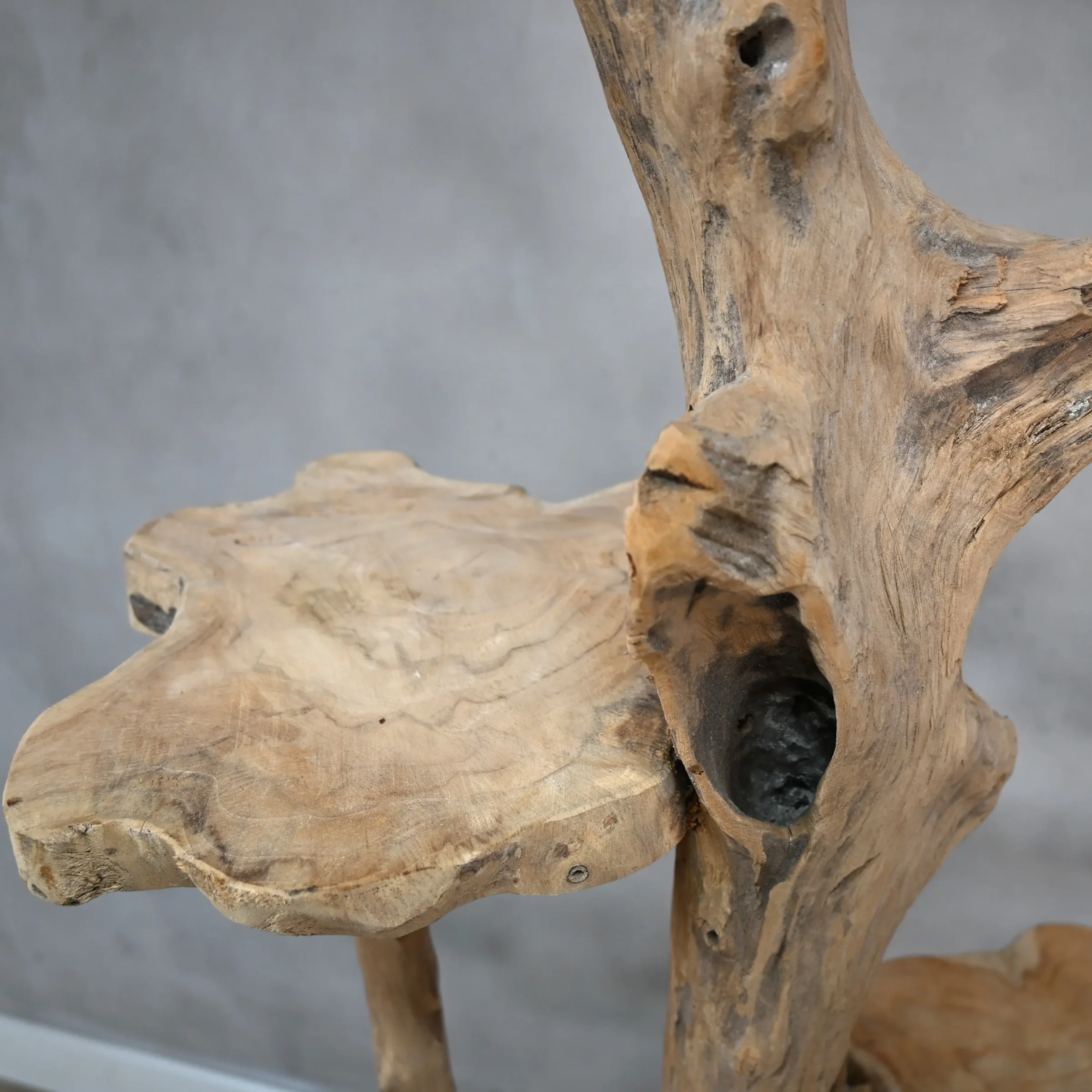 Mit ihren natürlichen Formen, ihrer einzigartigen Maserung und ihrem zeitlosen Charakter passt diese Teakholz-Etagere nahtlos in ländliche, industrielle oder böhmische Interieurs.