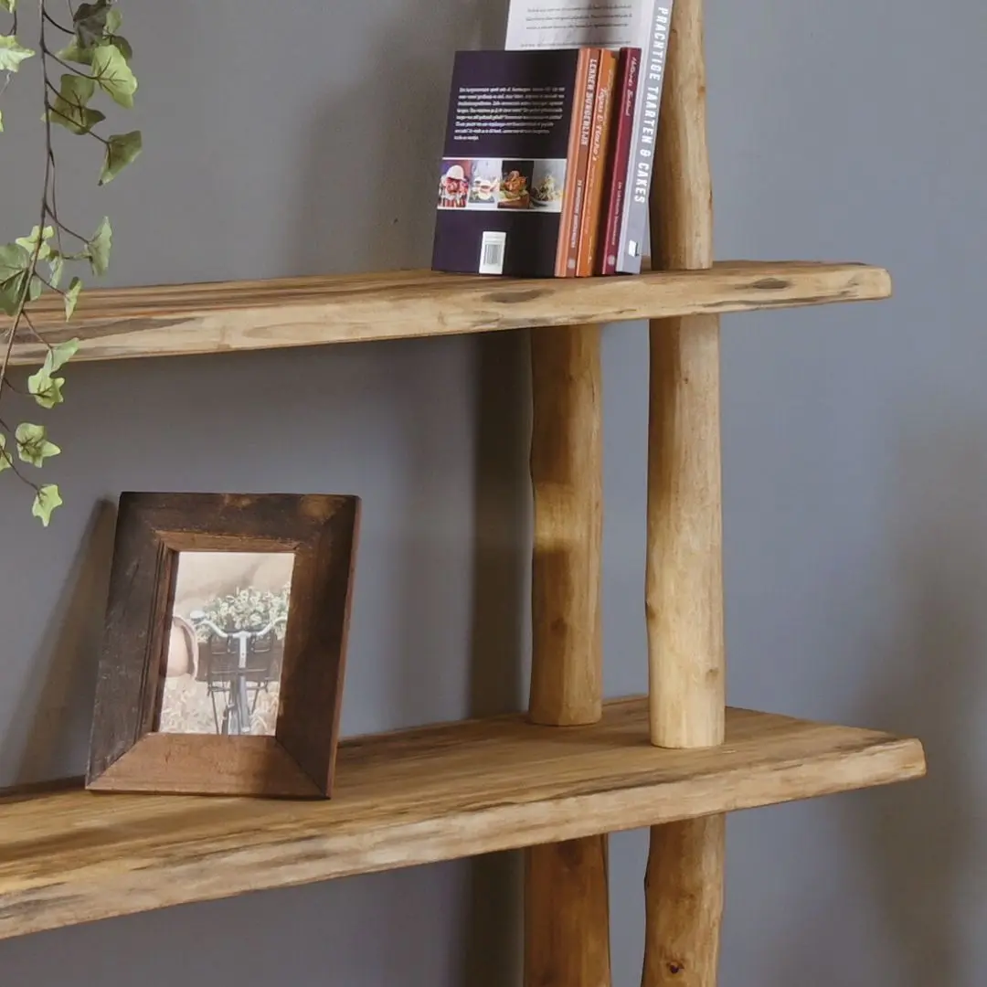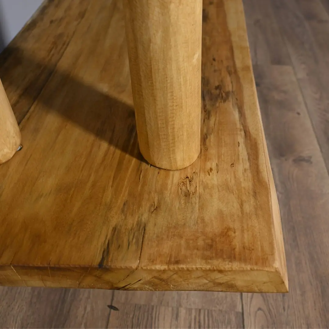 Baumstamm-Beistelltisch Einar mit geschliffenen Stämmen und 3 Brettern, die mit einem Old Naturel-Öl behandelt wurden.