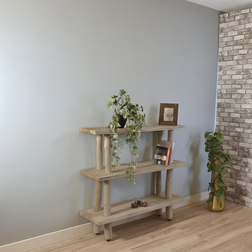 Baumstamm-Beistelltisch Javi mit robusten Stämmen und 3 abgeschliffenen Brettern, die mit einem grauen Waschöl behandelt wurden.