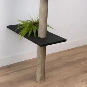 Der Kontrast zwischen dem organischen Stamm und den schlichten, schwarzen Regalböden sorgt für einen starken Blickfang, der den Raum unterteilt, ohne Licht und Sicht zu blockieren. Die offenen Ebenen bieten viel Platz für Pflanzen, Bücher und Dekoration, sodass du auf beiden Seiten des Raumteilers ganz einfach Atmosphäre schaffen kannst. Jeder Stamm hat seine eigene Form, wodurch jedes Exemplar einzigartig ist und subtil anders aussieht.