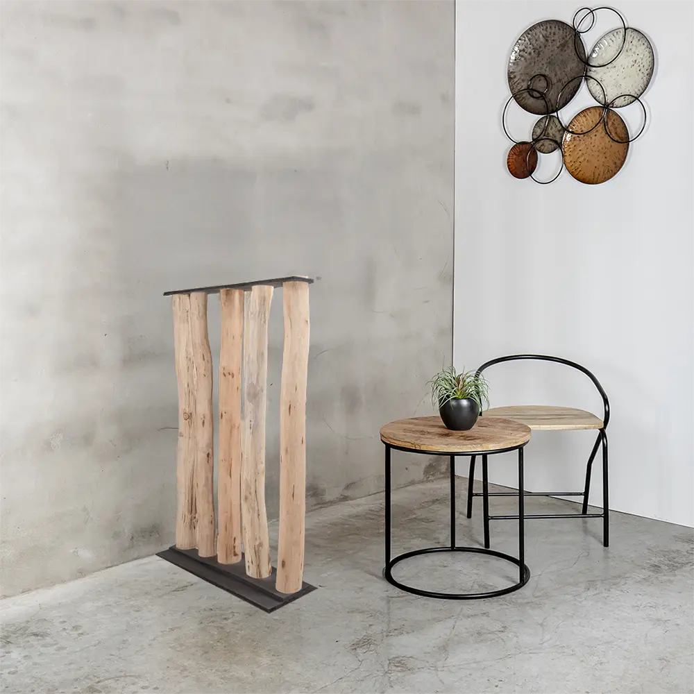 Die Stämme sind fest in einem schwarzen Holzsockel verankert, was dem Ganzen einen klaren, robusten Look verleiht. Mit seinem zeitlosen und minimalistischen Design eignet sich dieser Raumteiler ideal als stilvolle Trennwand zwischen Wohnräumen oder als dekoratives Element, das Atmosphäre in Büros, Gastronomiebetrieben oder Ausstellungsräumen schafft.