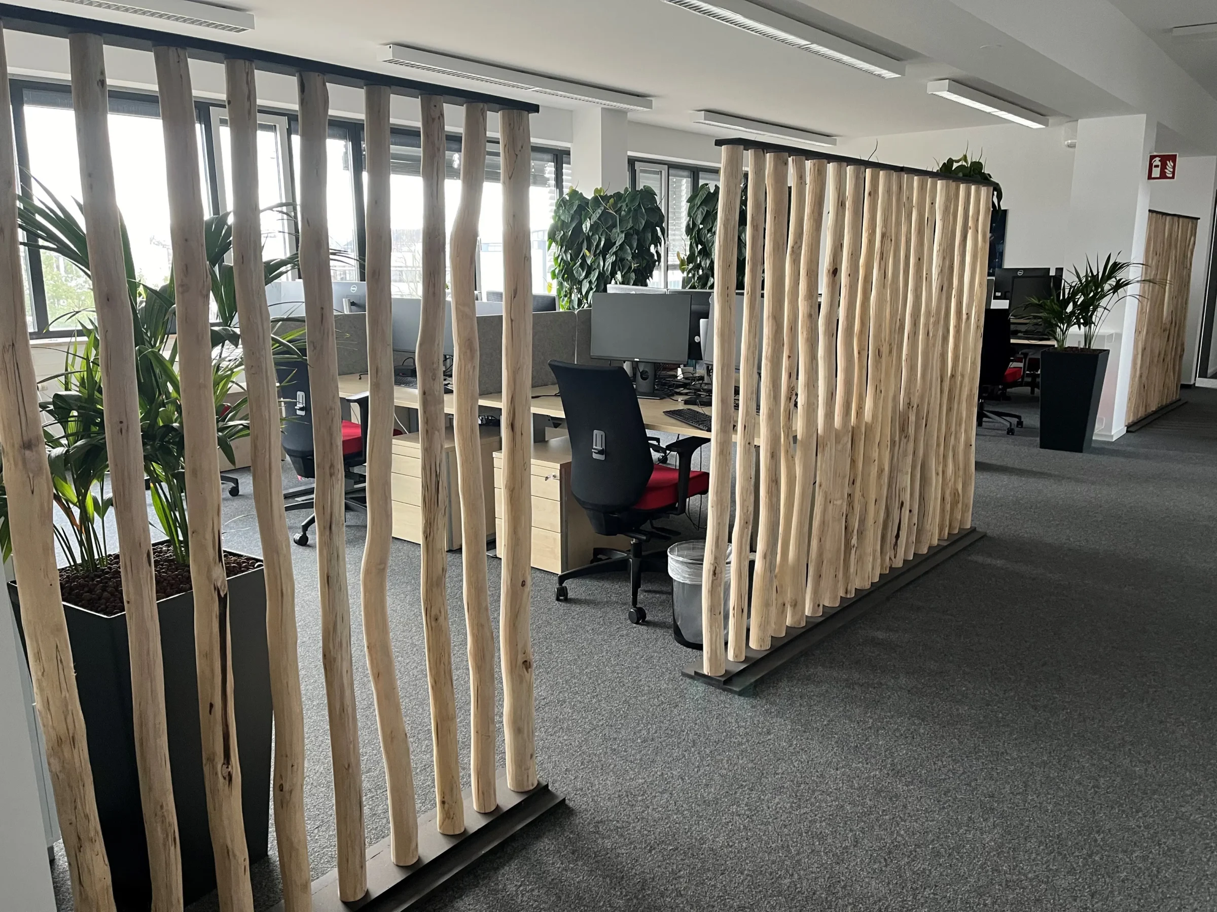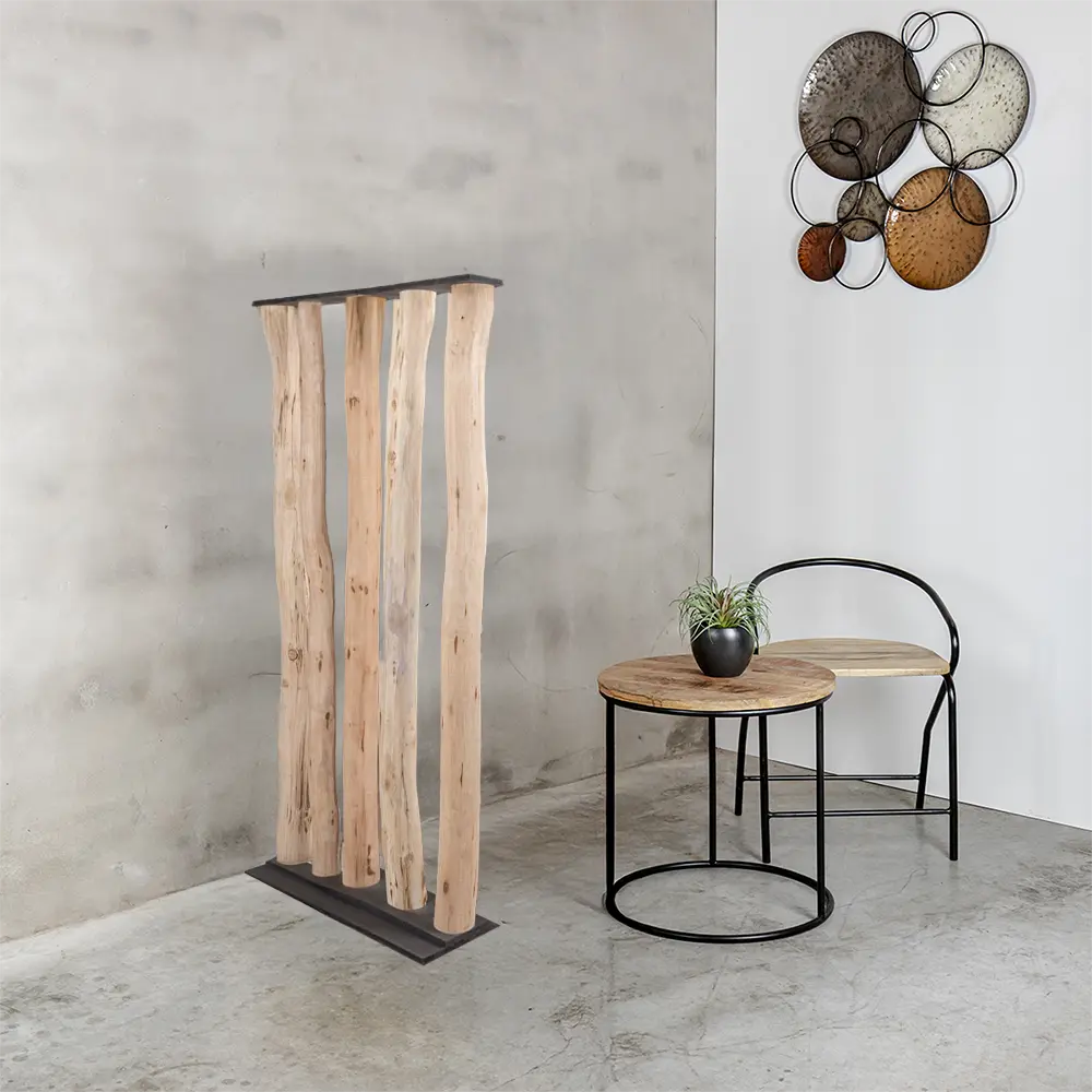 Die Stämme sind fest in einem schwarzen Holzsockel verankert, was dem Ganzen einen klaren, robusten Look verleiht. Mit seinem zeitlosen und minimalistischen Design eignet sich dieser Raumteiler ideal als stilvolle Trennwand zwischen Wohnräumen oder als dekoratives Element, das Atmosphäre in Büros, Gastronomiebetrieben oder Ausstellungsräumen schafft.