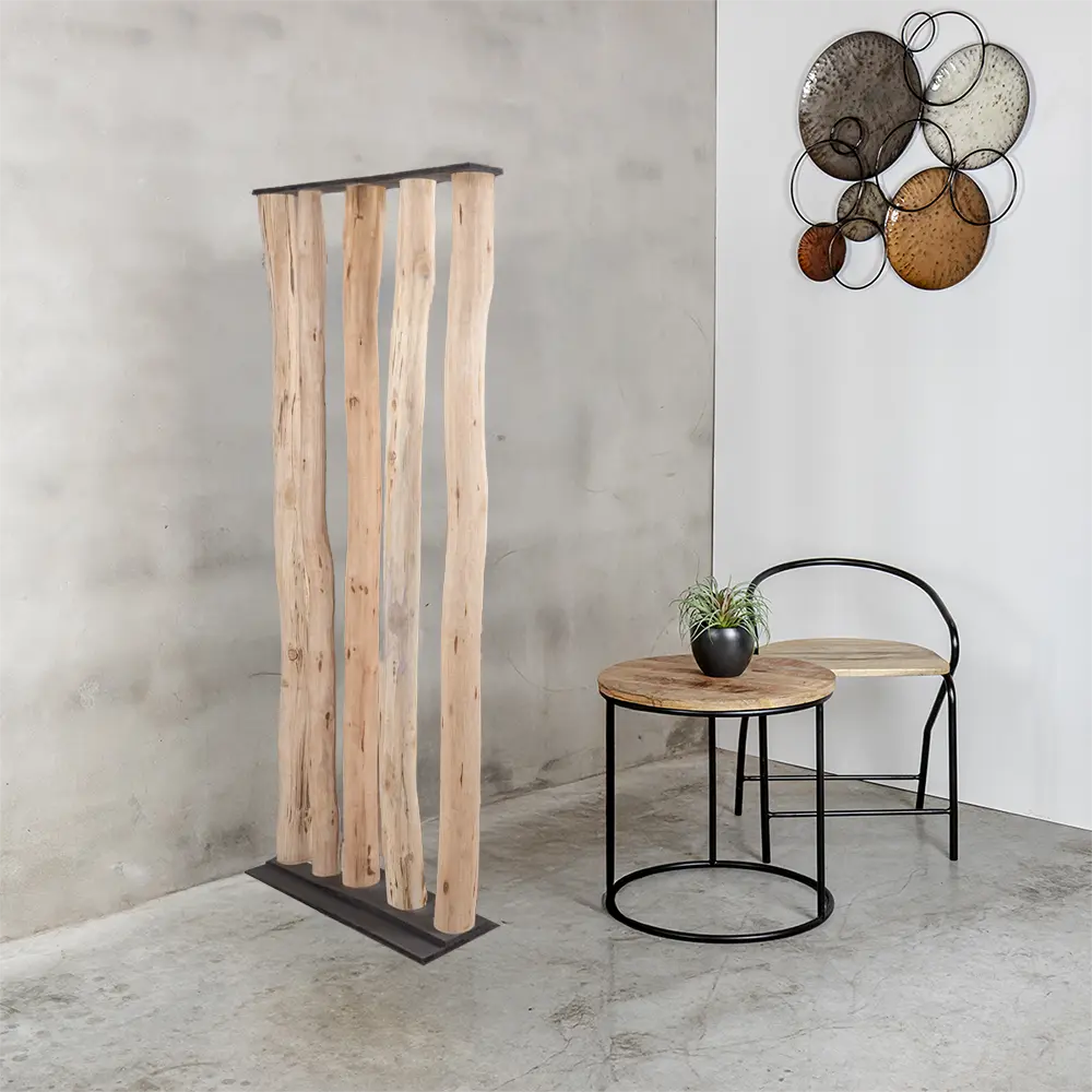Die Stämme sind fest in einem schwarzen Holzsockel verankert, was dem Ganzen einen klaren, robusten Look verleiht. Mit seinem zeitlosen und minimalistischen Design eignet sich dieser Raumteiler ideal als stilvolle Trennwand zwischen Wohnräumen oder als dekoratives Element, das Atmosphäre in Büros, Gastronomiebetrieben oder Ausstellungsräumen schafft.