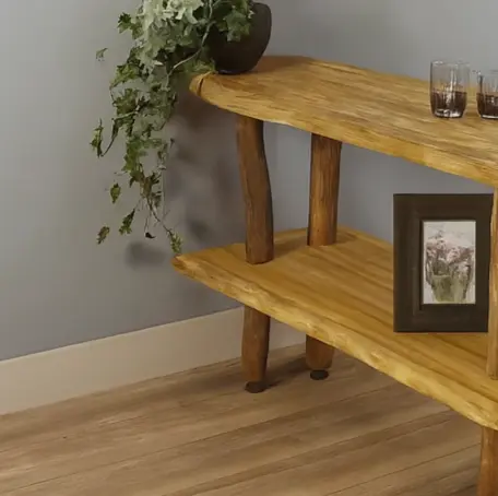 Baumstamm-Raumteiler Einar mit natürlichen Stämmen und 2 geschliffenen Brettern, die mit einem Old Naturel-Öl behandelt wurden.