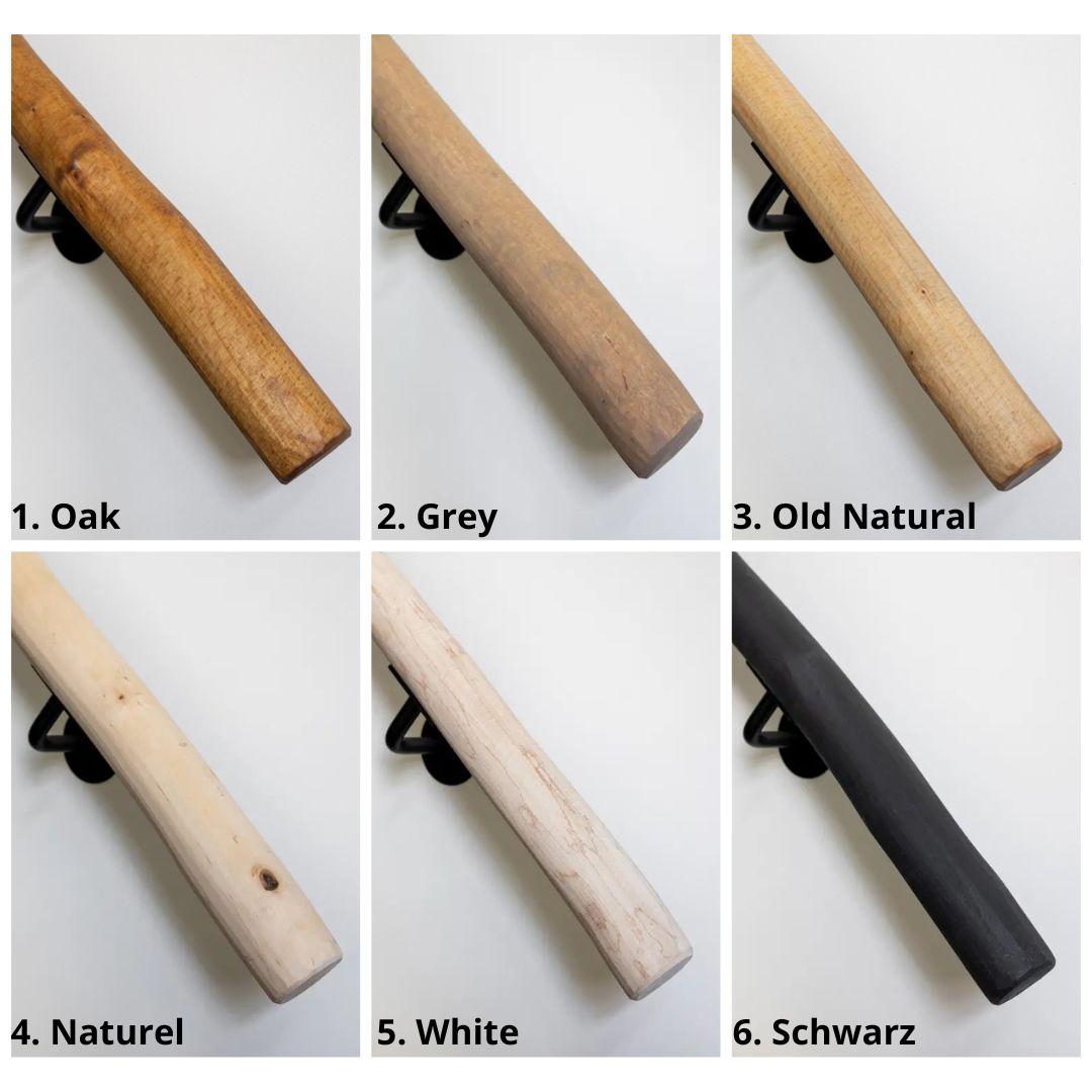 Die Farbe wird durch eine Ölbehandlung aufgetragen. Diese Ölbehandlung verleiht den Handläufen nicht nur die gewünschte Farbe, sondern sorgt auch für eine Schutzschicht, die die Lebensdauer der Handläufe verlängert und schmutzabweisend ist. Bitte beachte, dass die Farbe des Musters nie ganz genau mit der Farbe der Treppengeländer übereinstimmt. Die Geländer sind ein Naturprodukt, sodass die Wirkung des Öls bei jedem Stamm leicht unterschiedlich ist. Natürlich versuchen wir, die Farbe der Geländer in einer Bestellung so weit wie möglich anzugleichen.