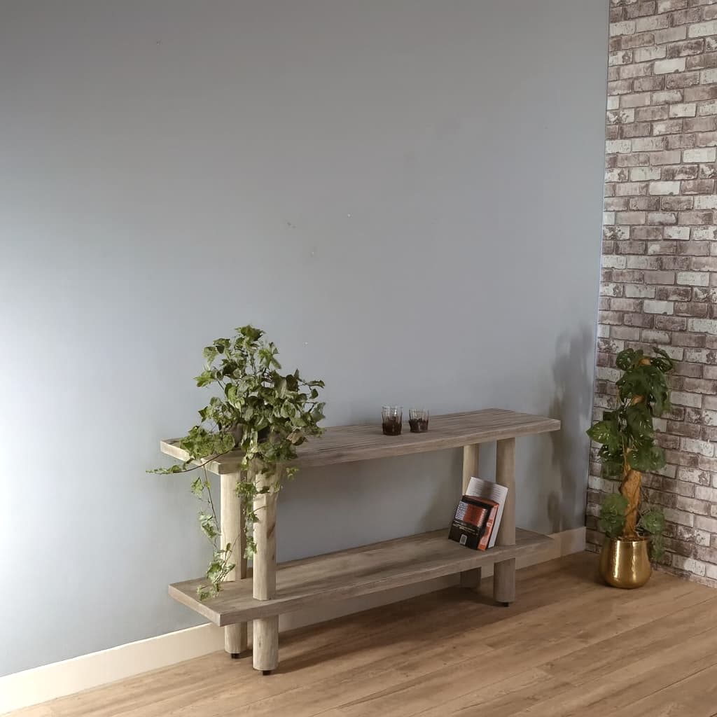 TV-Möbel Javi aus Baumstämmen mit geschliffenen Stämmen und 2 geschliffenen Brettern, die mit einem grauen Waschöl behandelt wurden.
