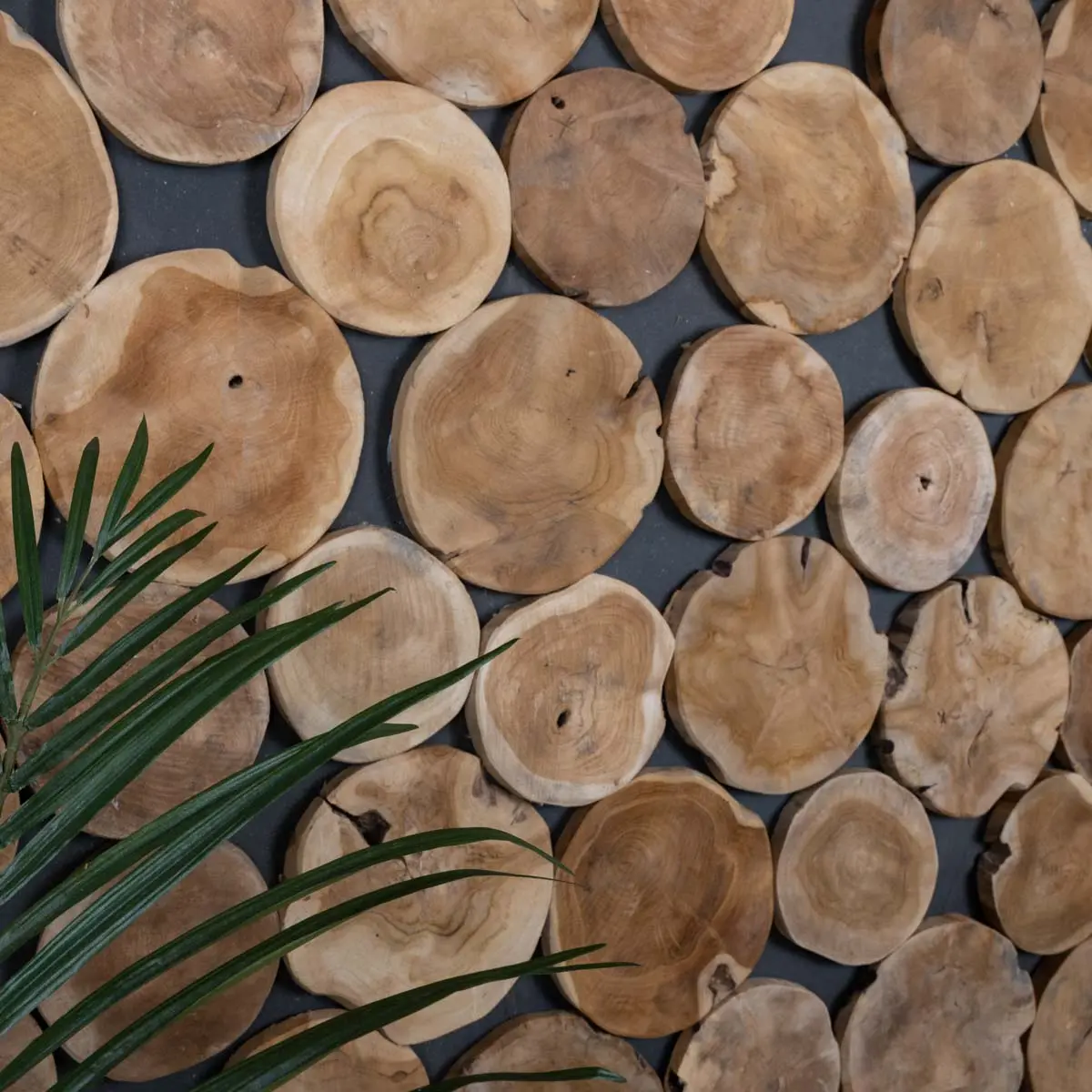 Die Baumstamm-Wanddekoration Bjorn ist ein mutiges und stilvolles Statement für jede Wand. Dieses einzigartige Paneel besteht aus massiven Teakholzscheiben, die jeweils einen Durchmesser von etwa 20 bis 25 cm haben. Die warmen Farbtöne und die natürliche Maserung des Teakholzes sorgen für einen robusten, stimmungsvollen Look.