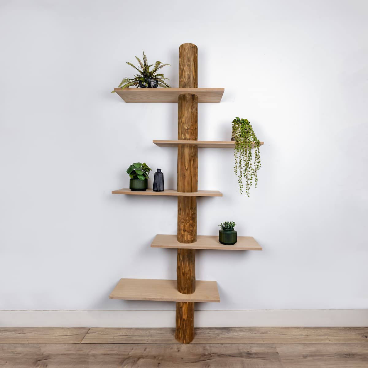 Baumstamm-Wandschrank Vita mit einem natürlichen Baumstamm, der mit Eichenöl behandelt wurde, und 5 naturbelassenen, versetzten Regalböden.