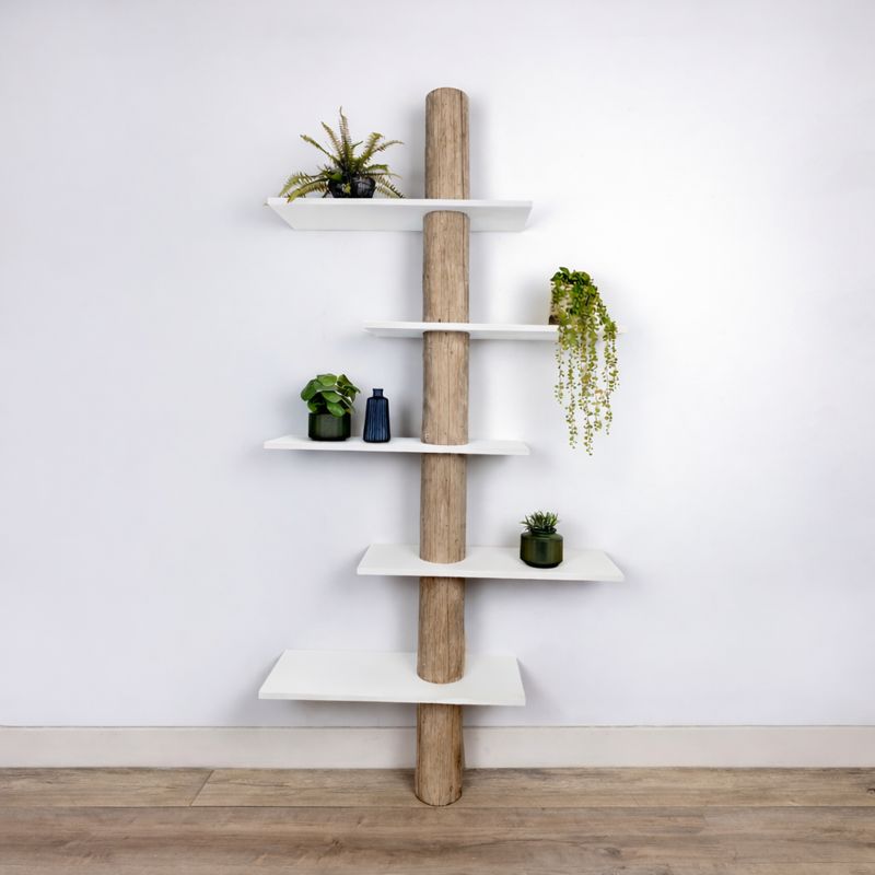 Wandschrank Javi aus Baumstammholz mit einem natürlichen Baumstamm, der mit einem grauen Öl behandelt wurde, und 5 versetzten, weißen Regalböden.