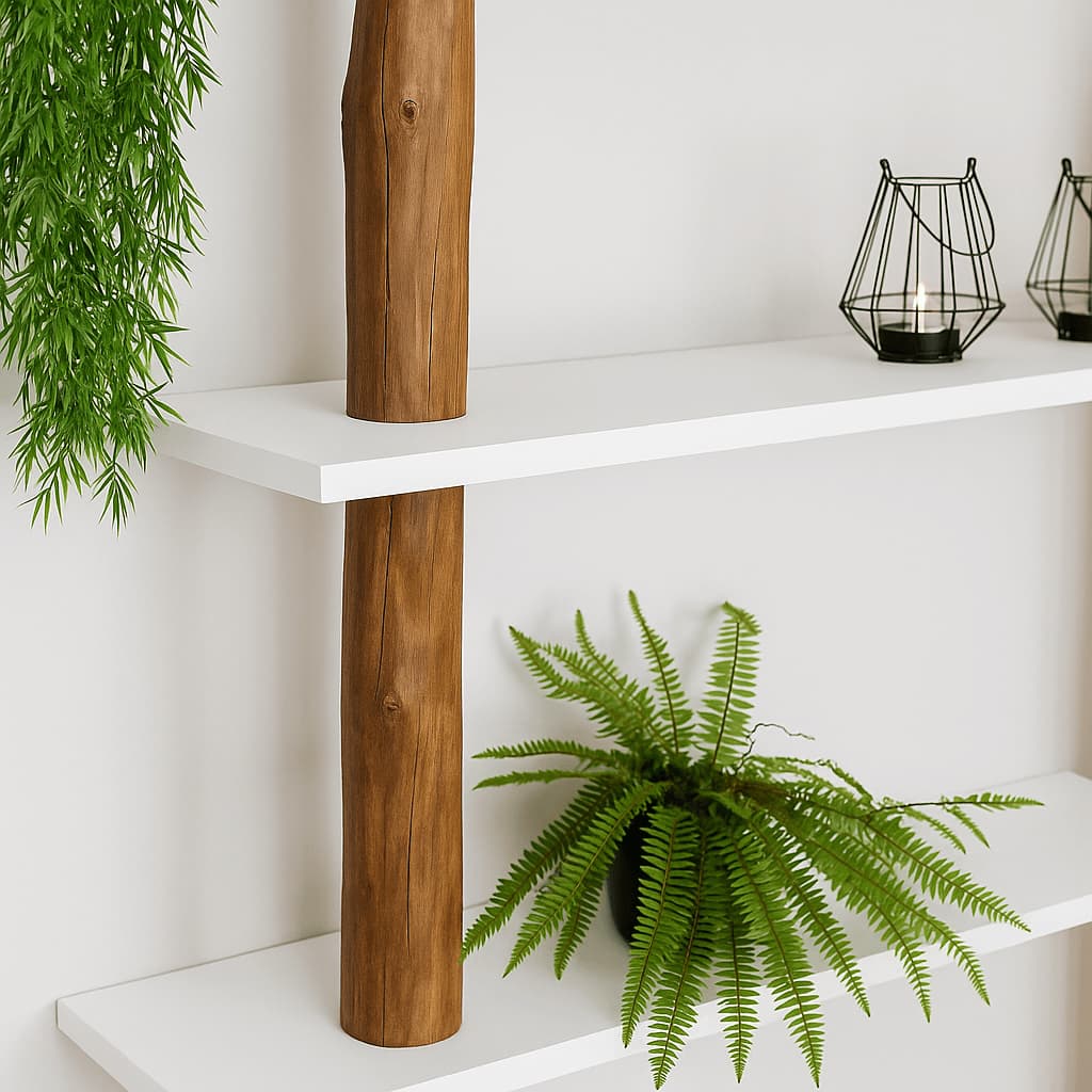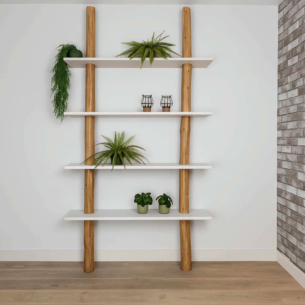 Baumstamm-Wandschrank Tarik mit 2 natürlichen Baumstämmen, die mit einem Old Naturel-Öl behandelt wurden, und 4 geraden, weißen Regalböden.