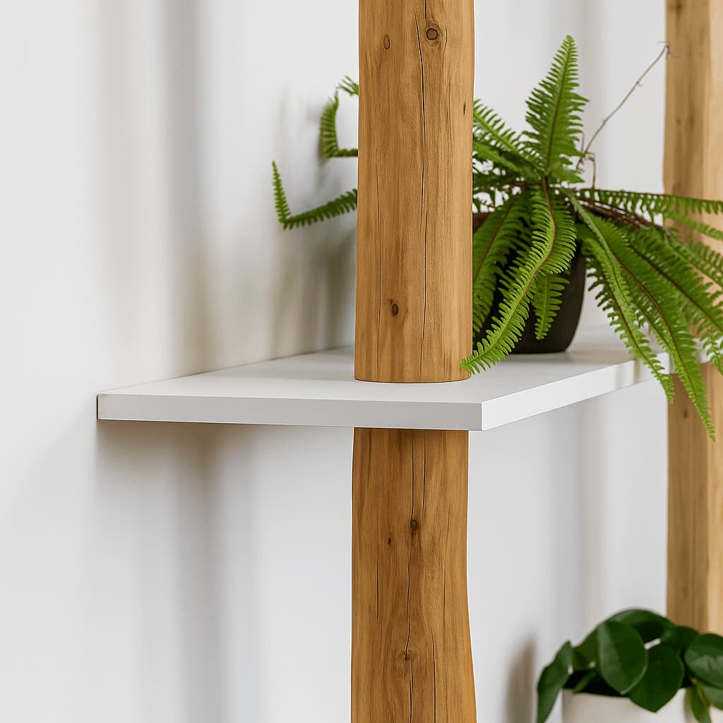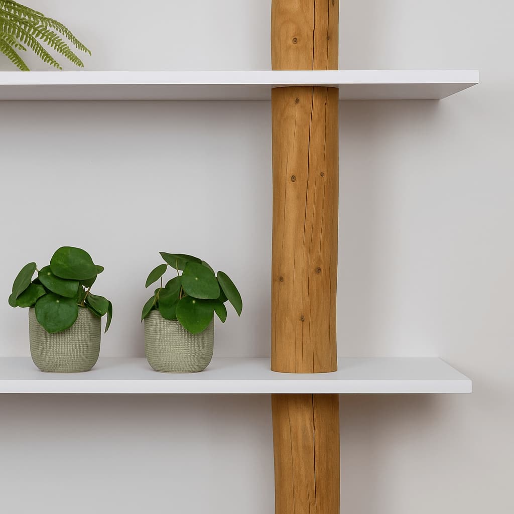 Dieses Wandregal bringt die Authentizität von zwei natürlichen Baumstämmen mit dem klaren Look von weißen MDF-Brettern zusammen. Die Bretter sind gerade angebracht, was für einen ruhigen und symmetrischen Look sorgt. Ein echter Baumstamm bildet das vertikale Rückgrat und kontrastiert mit seiner organischen Form schön zu den klar gestalteten, weißen Brettern. Der massive Stamm ist mit einem warmen Old Naturel-Öl behandelt, das ihm zusätzliche Tiefe und Charakter verleiht.