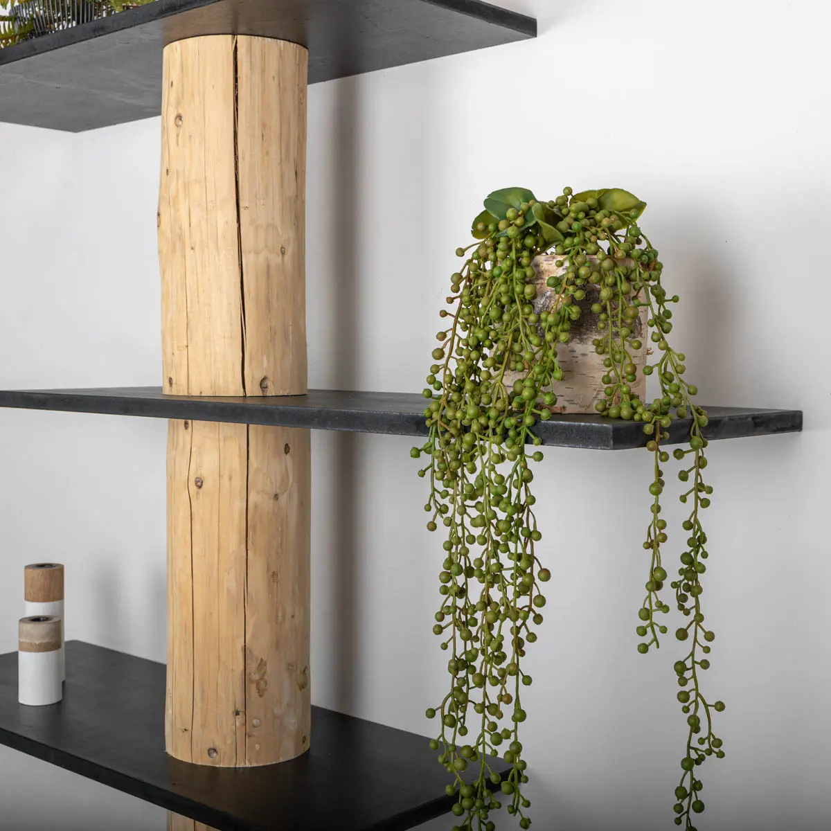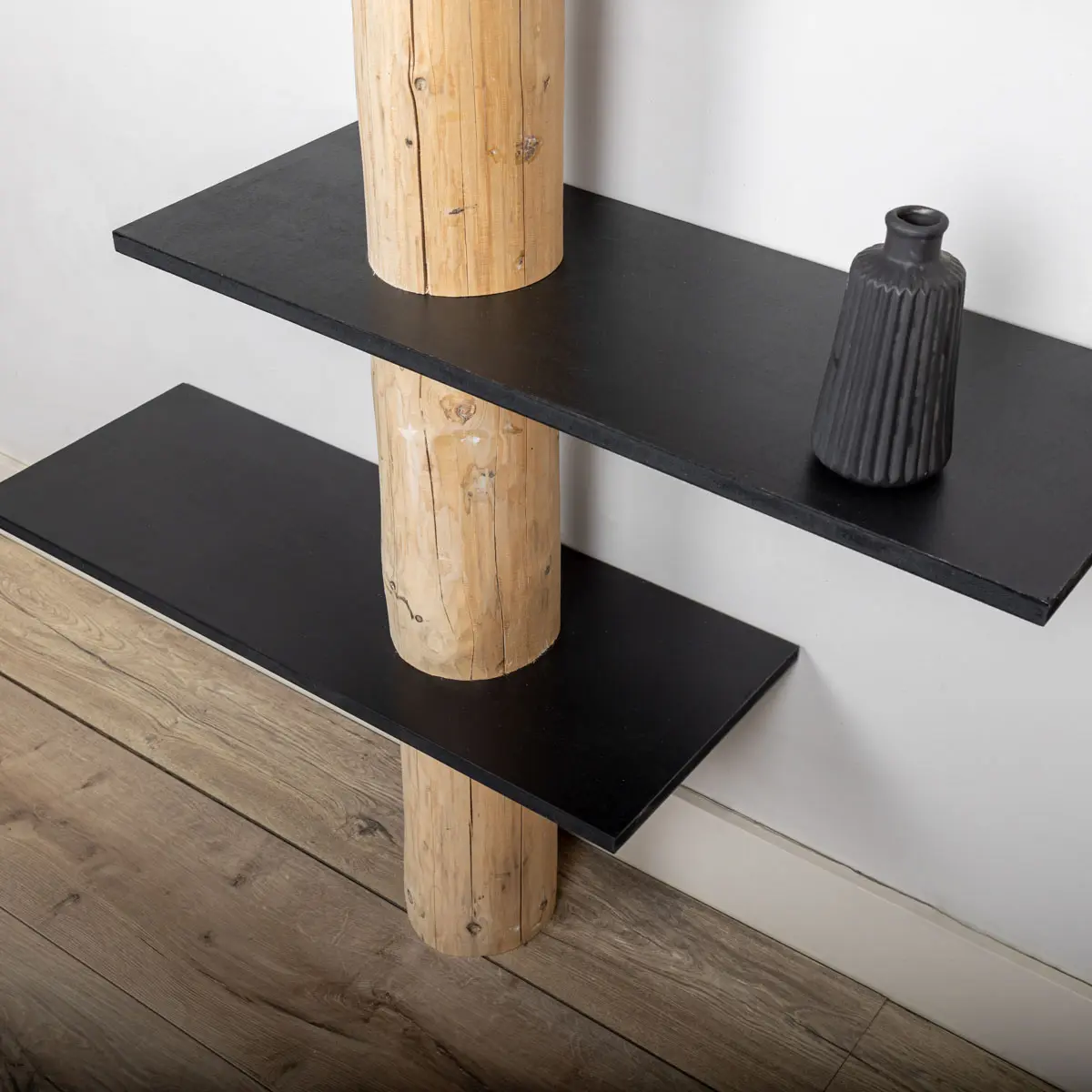 Magnus Baumstamm-Wandschrank mit einem natürlichen Baumstamm und 5 schwarzen, versetzten Regalböden.