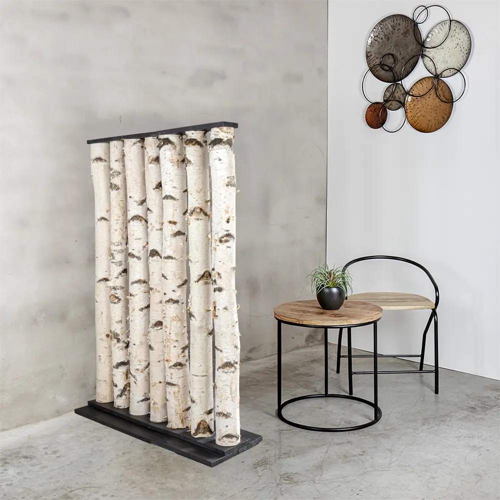 Der Raumteiler Thor bringt den robusten Charme von echten Birkenstämmen mit Rinde und dem modernen Look eines schwarzen Fußes zusammen. Das macht ihn zu einem perfekten Blickfang für alle, die einen natürlichen Look mit einem coolen Akzent mögen.
