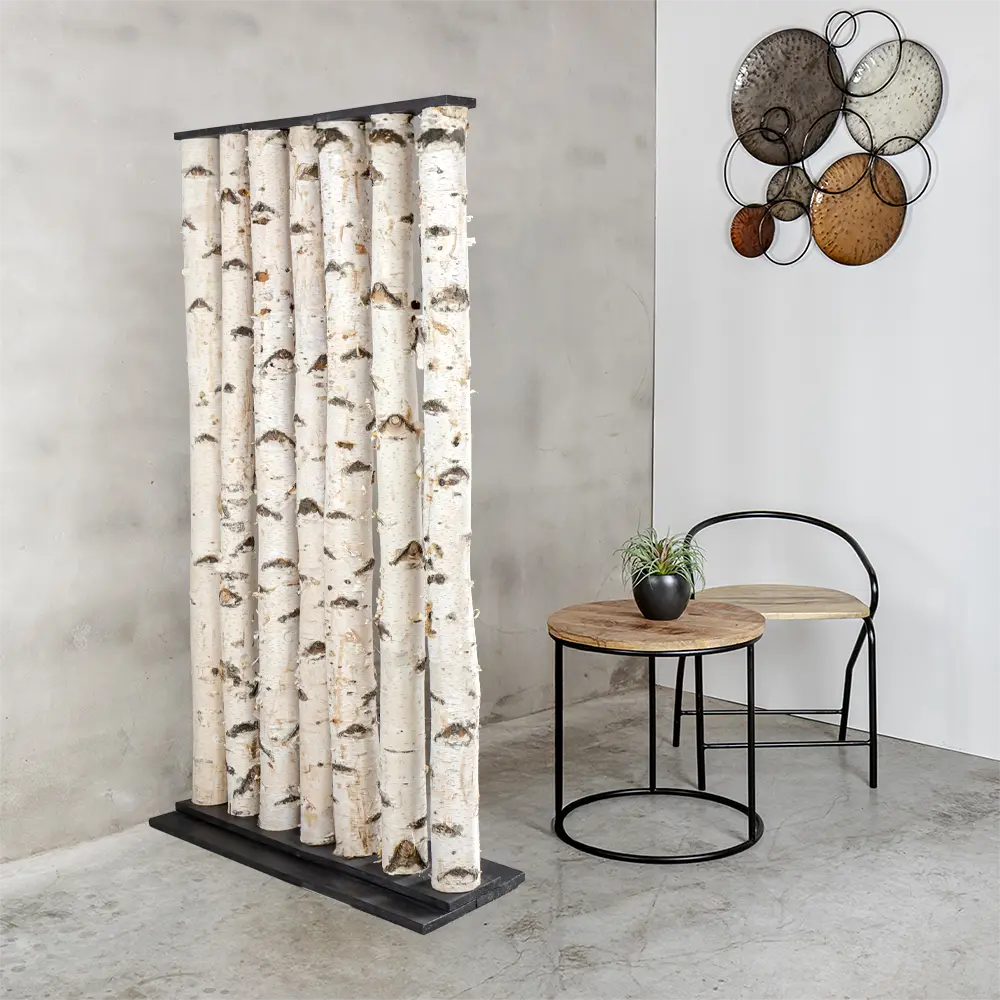Der Raumteiler Thor bringt den robusten Charme von echten Birkenstämmen mit Rinde und dem modernen Look eines schwarzen Fußes zusammen. Das macht ihn zu einem perfekten Blickfang für alle, die einen natürlichen Look mit einem coolen Akzent mögen.