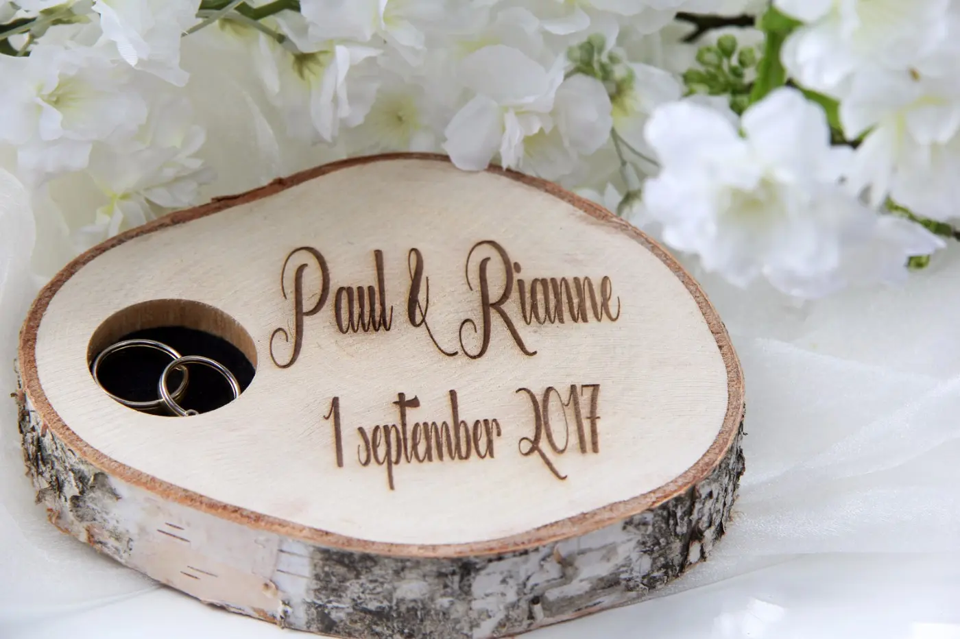 Die Ringscheibe kann mit einem Text, Namen, Datum und/oder einem Symbol deiner Wahl personalisiert werden. Die Gravur wird sorgfältig angebracht und verleiht ihr einen warmen, natürlichen Look, der perfekt zu einem ländlichen, romantischen oder böhmischen Ambiente passt.