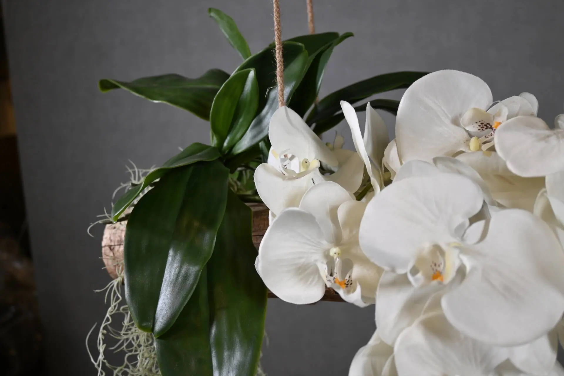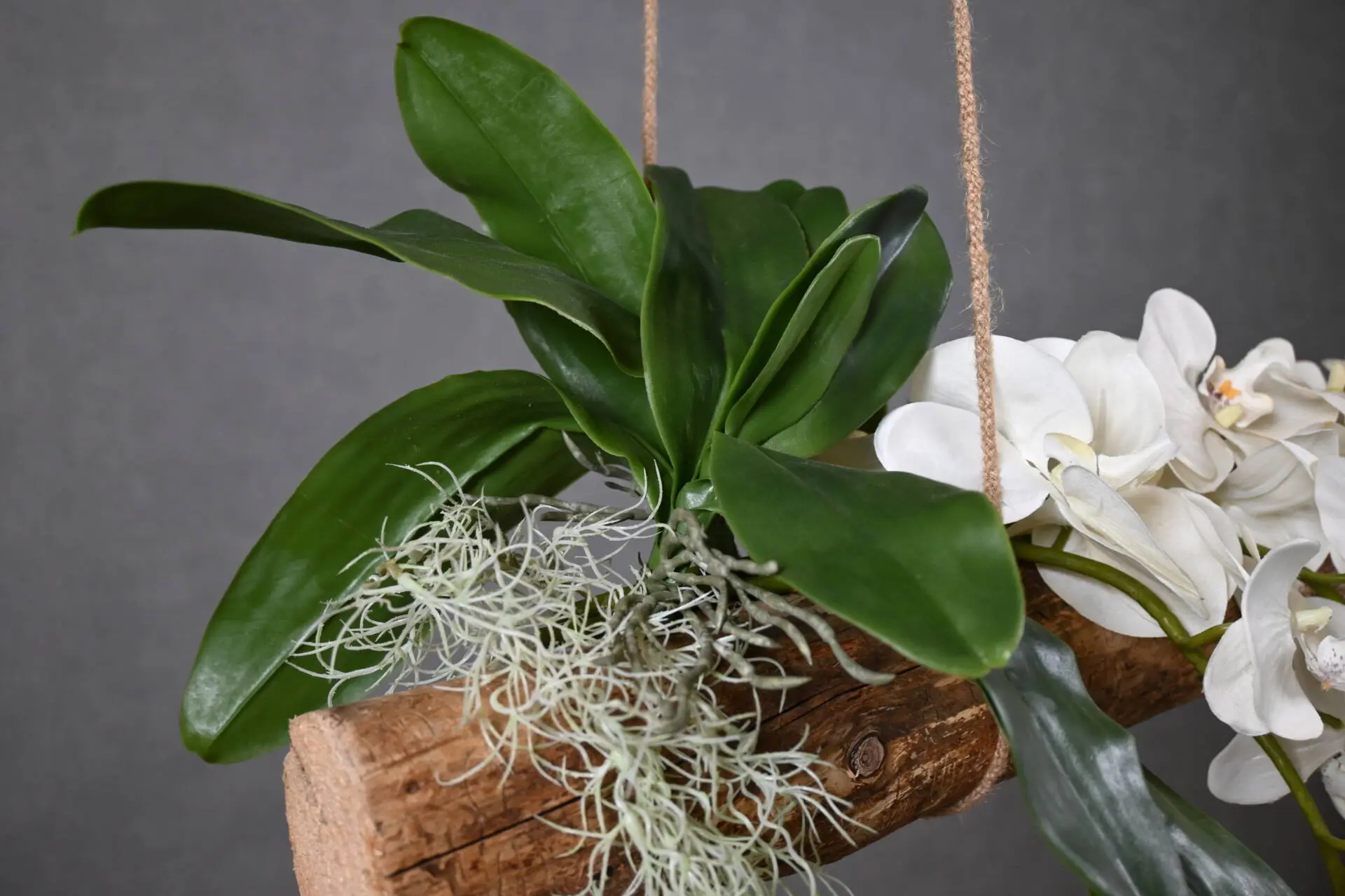 Dieser Baumstamm-Anhänger bringt eine natürliche und stilvolle Atmosphäre in dein Zuhause. Der robuste Holzstamm ist entrindet und zeigt eine schöne Kombination aus Kunstdekoration: naturgetreue Orchideen, frische grüne Blätter und hängendes Grünzeug.