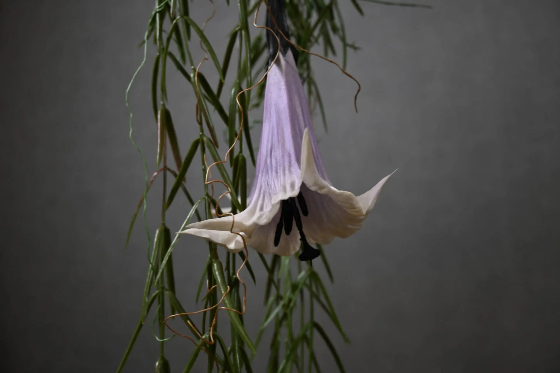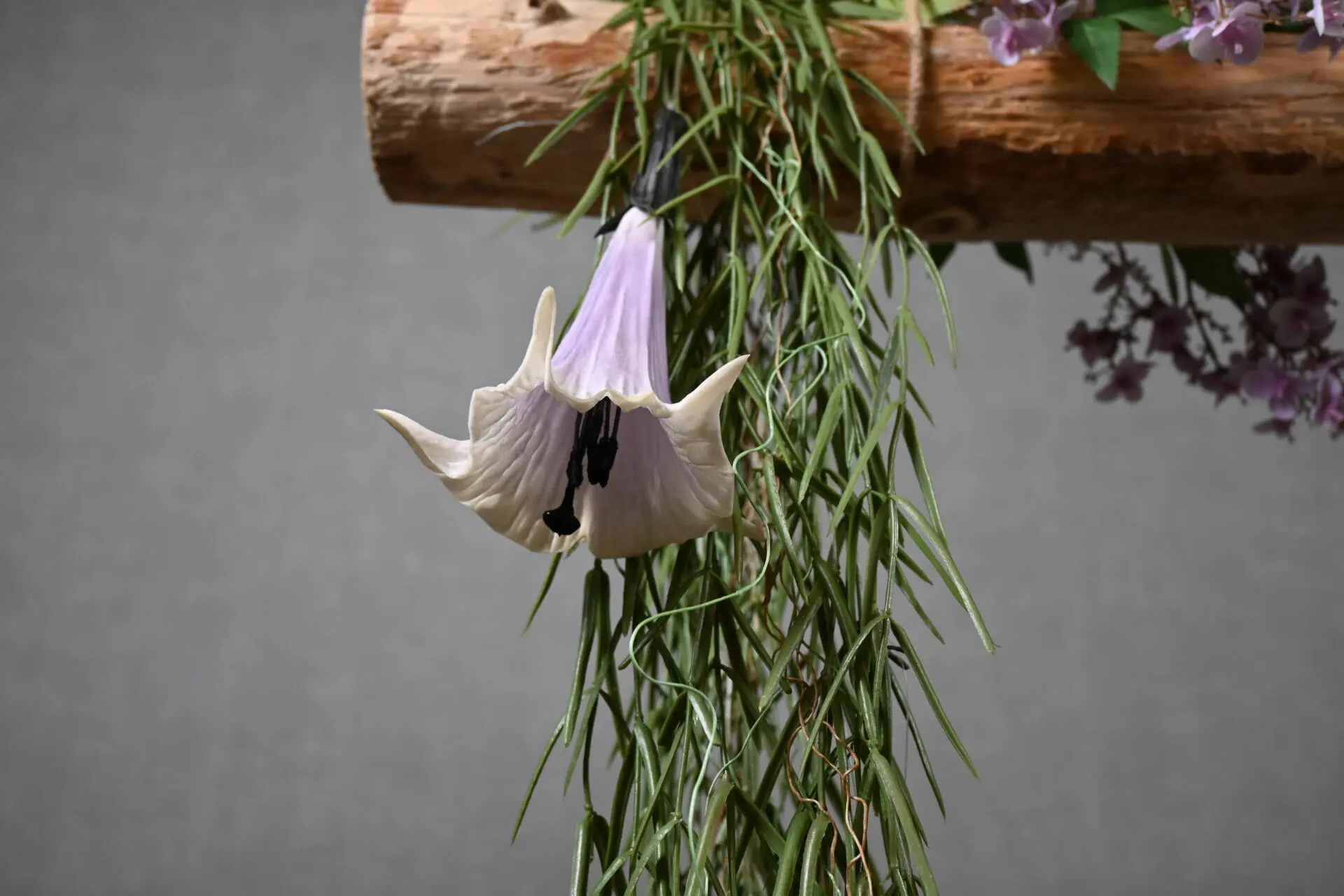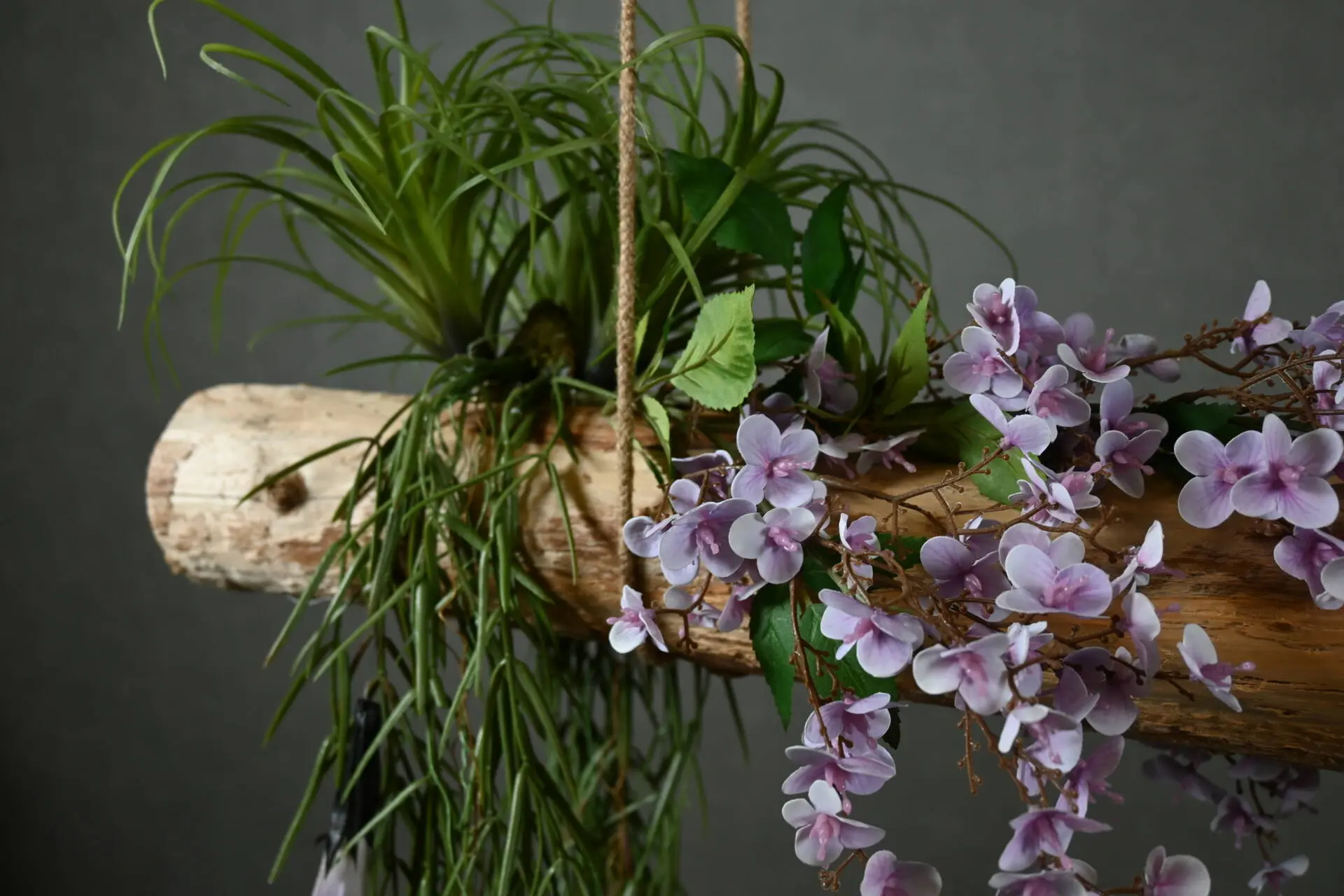 Verleihe deinem Interieur einen natürlichen und stimmungsvollen Look mit diesem Baumstamm-Anhänger. Der robuste Holzstamm ist wunderschön mit violetten künstlichen Stechapfelblumen und Wildrosenzweigen, Luftpflanzen und grünen Akzenten verziert. Ein echter Blickfang über dem Esstisch, im Wohnzimmer oder auch im Flur.