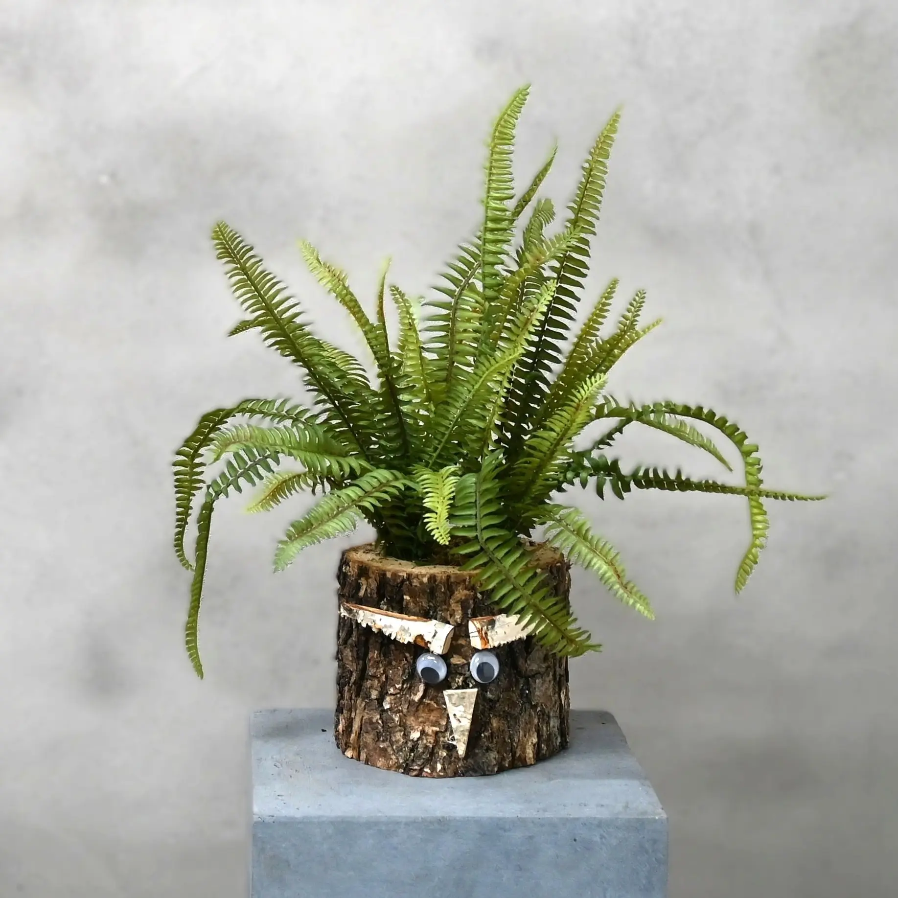 Er eignet sich perfekt als dekorativer Akzent auf einem Tisch, einem Schrank oder einer Fensterbank. Die Kombination aus dem robusten Holz und dem luftigen Grün sorgt für einen frischen, verspielten und waldigen Effekt.
