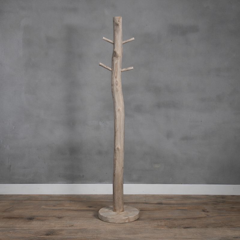 Stehender, entrindeter Birken-Kleiderständer Javi, mit grauem Öl behandelt und mit einem runden Holzfuß und 8 Holzhaken versehen.