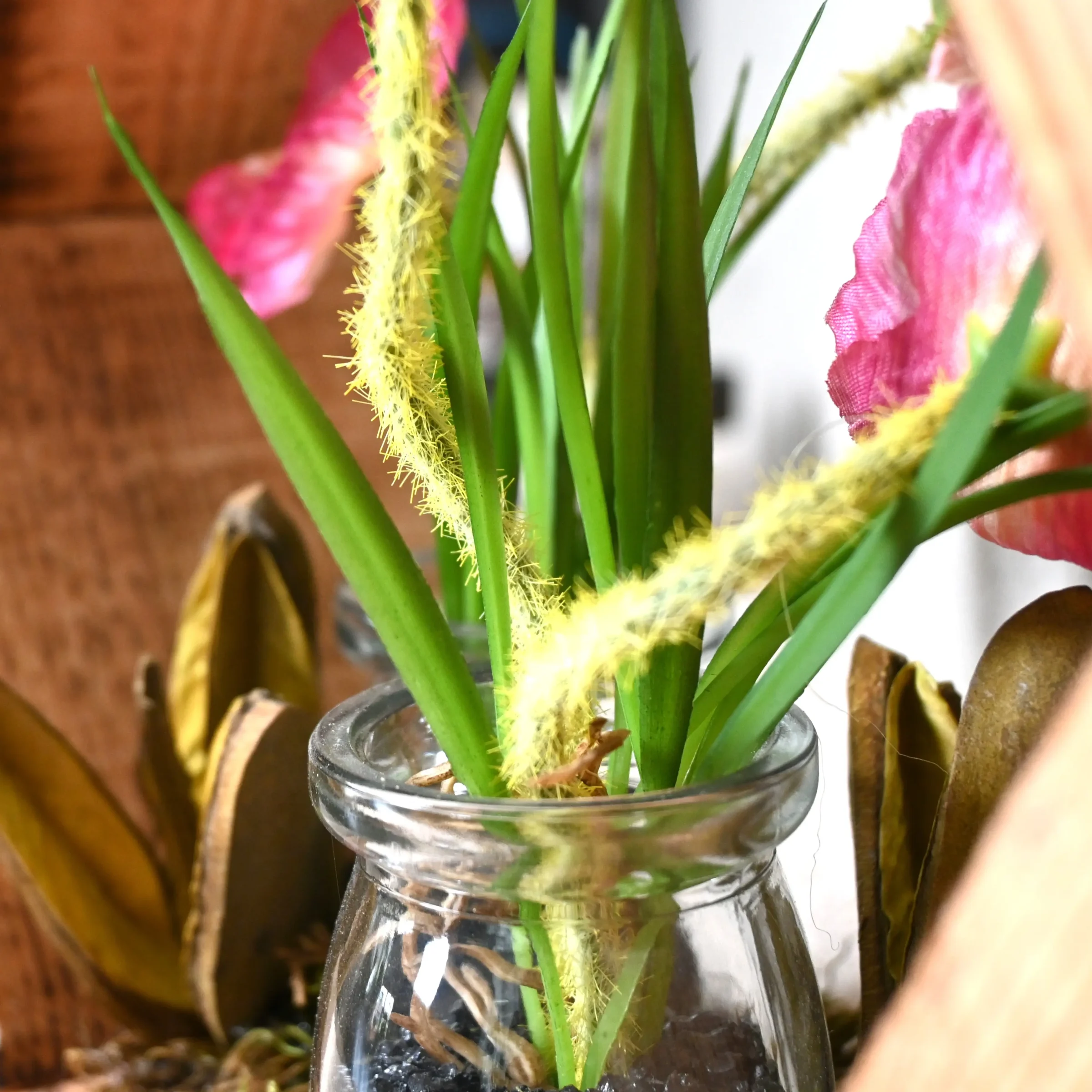Diese Kunstpflanze in einem hölzernen Sechseck kombiniert klare Linien mit warmen, natürlichen Materialien. Die sechseckige Wanddekoration ist aus massivem Holz gefertigt und zeigt eine sorgfältig ausgewählte, lebensechte rosa Anemone in einer eleganten Glasvase. Das Ergebnis ist ein moderner und wartungsfreier Akzent, der mühelos in jedes Interieur passt – von skandinavisch bis industriell.
