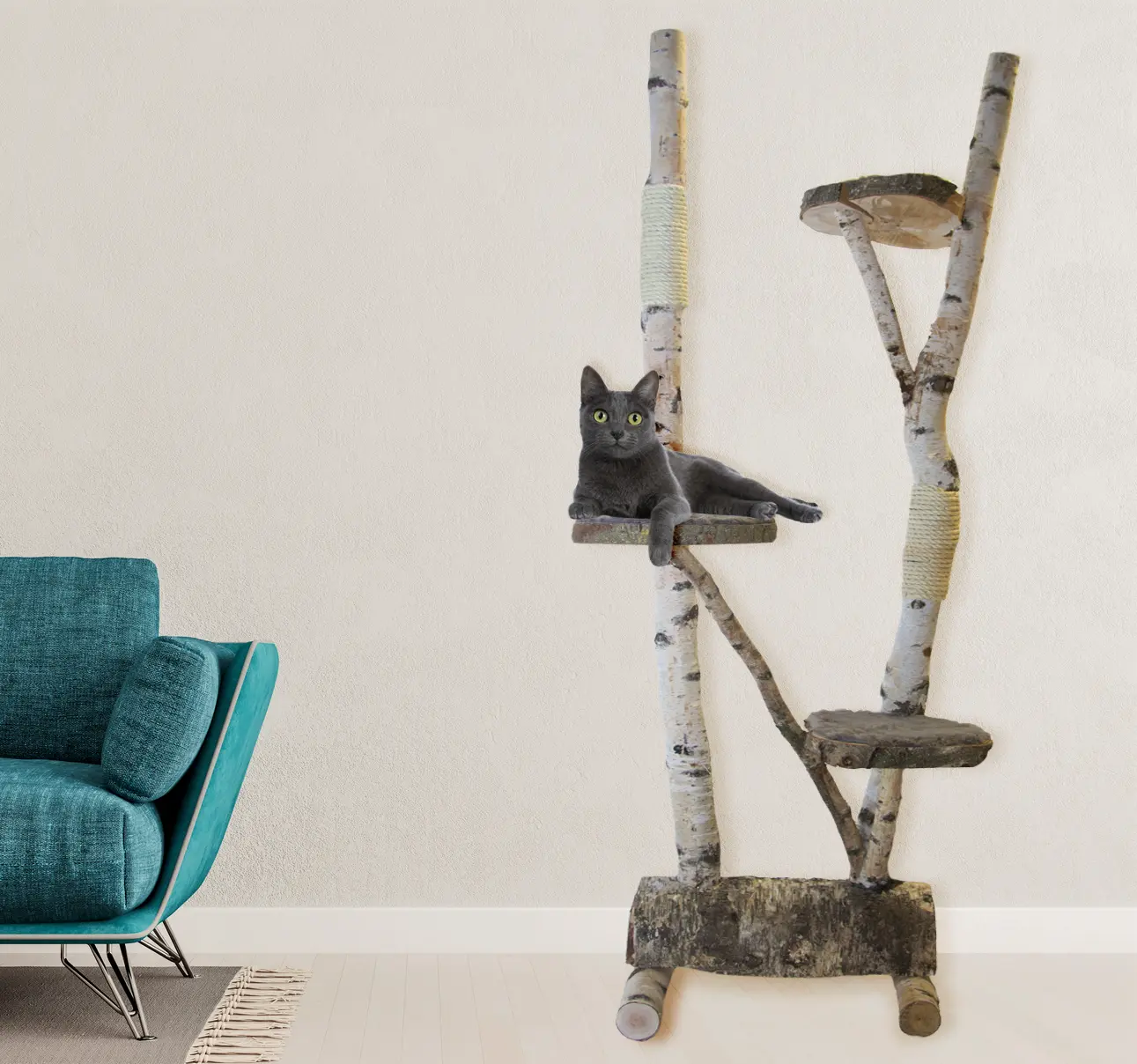 Der Birkenkratzbaum Mimi ist ein einzigartiger und natürlicher Kratzbaum aus robusten Birkenstämmen. Dank seiner robusten Konstruktion und den verschiedenen Plattformen bietet dieser Kratzbaum deiner Katze viele Möglichkeiten zum Spielen, Klettern, Ausruhen und Ausschau halten.