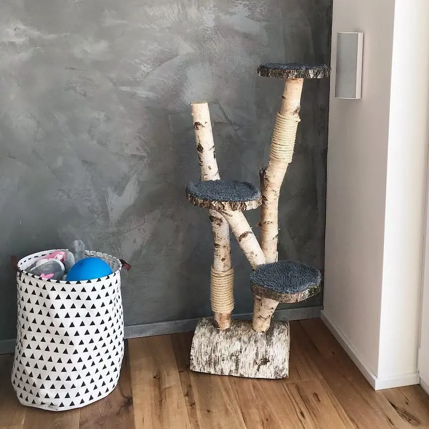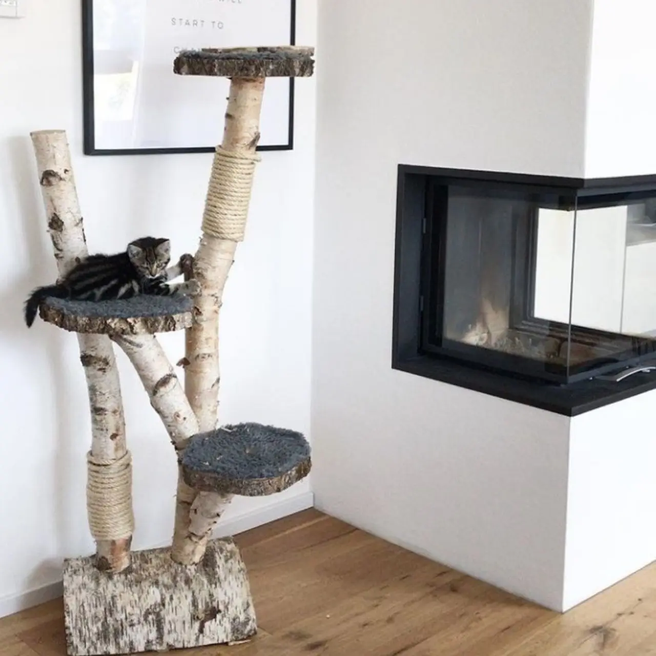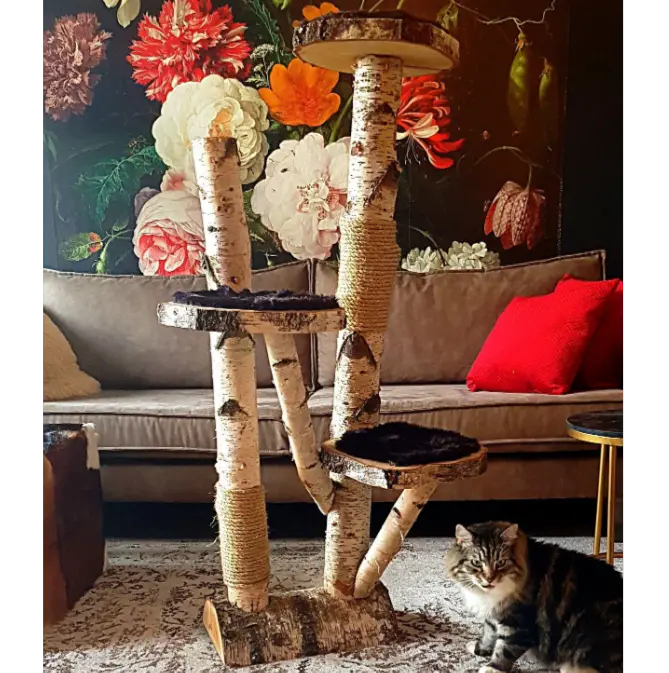 Die Stämme sind unbehandelt und behalten ihre natürliche Rinde, die für ein robustes Aussehen und zusätzlichen Halt für deine Katze sorgt. Der Kratzbaum wird standardmäßig ohne Kratzgewebe geliefert, kann aber auch mit Kratzgewebe bestellt werden, damit deine Katze bequem liegen und entspannen kann.