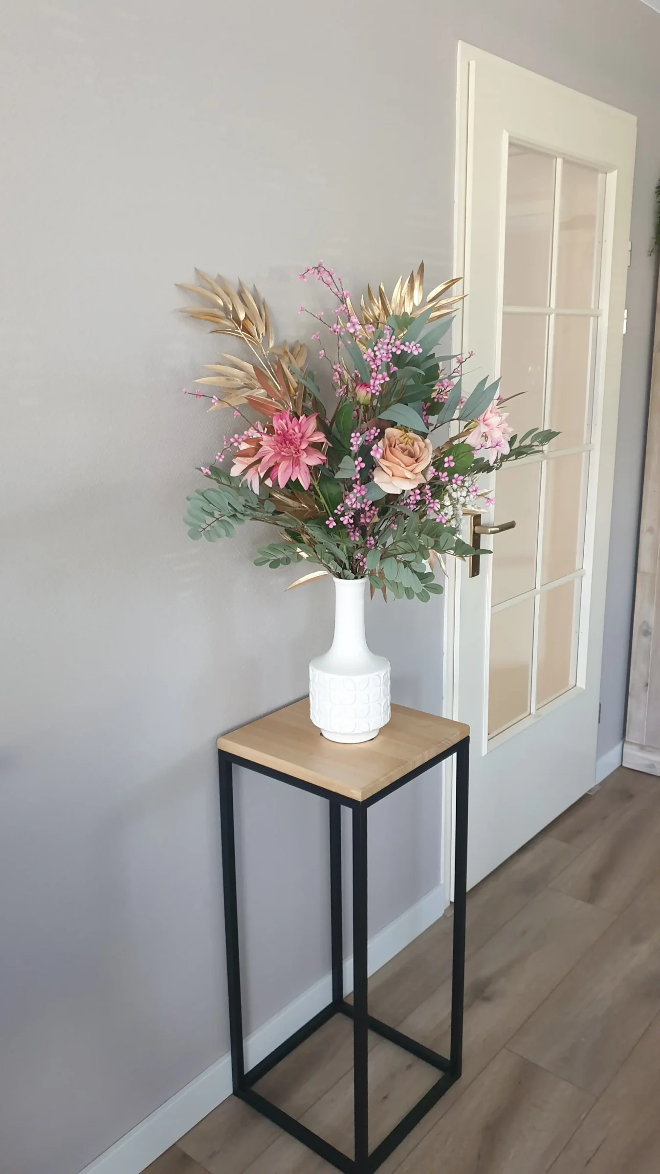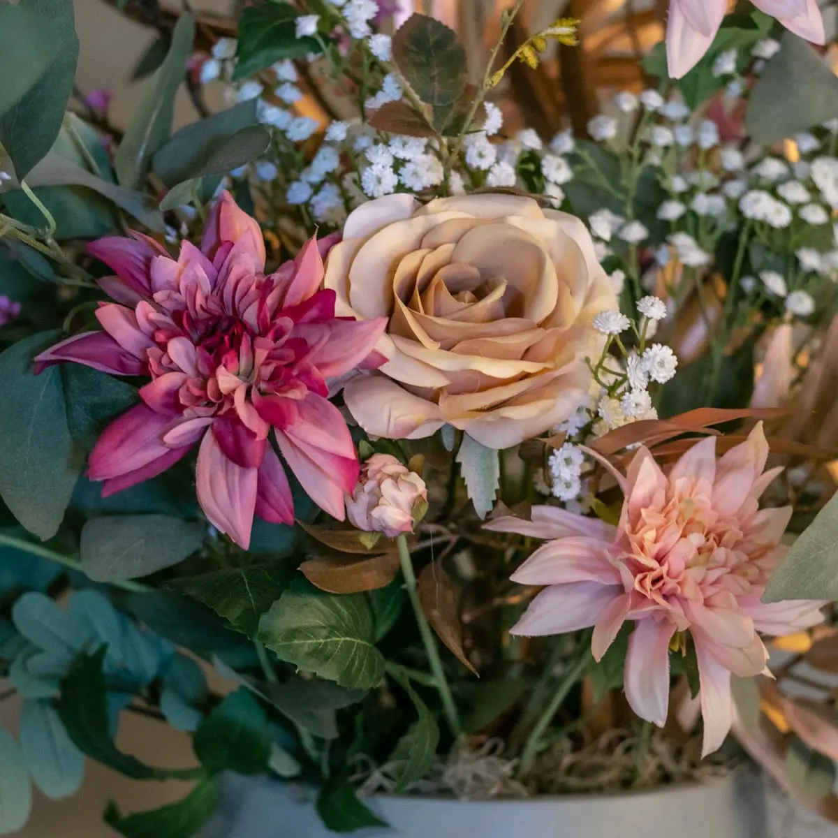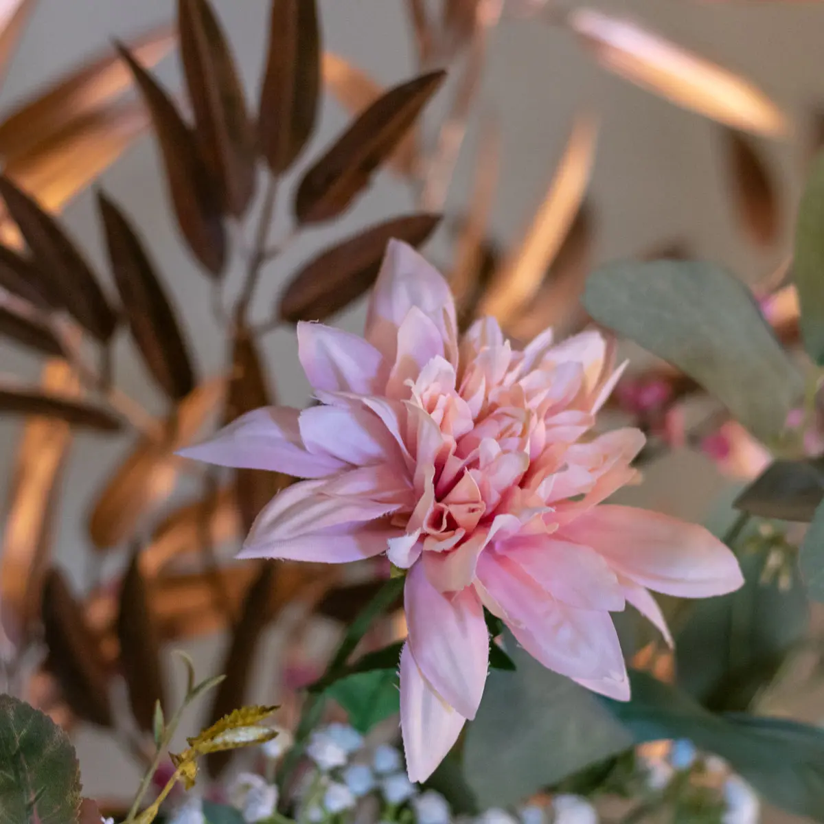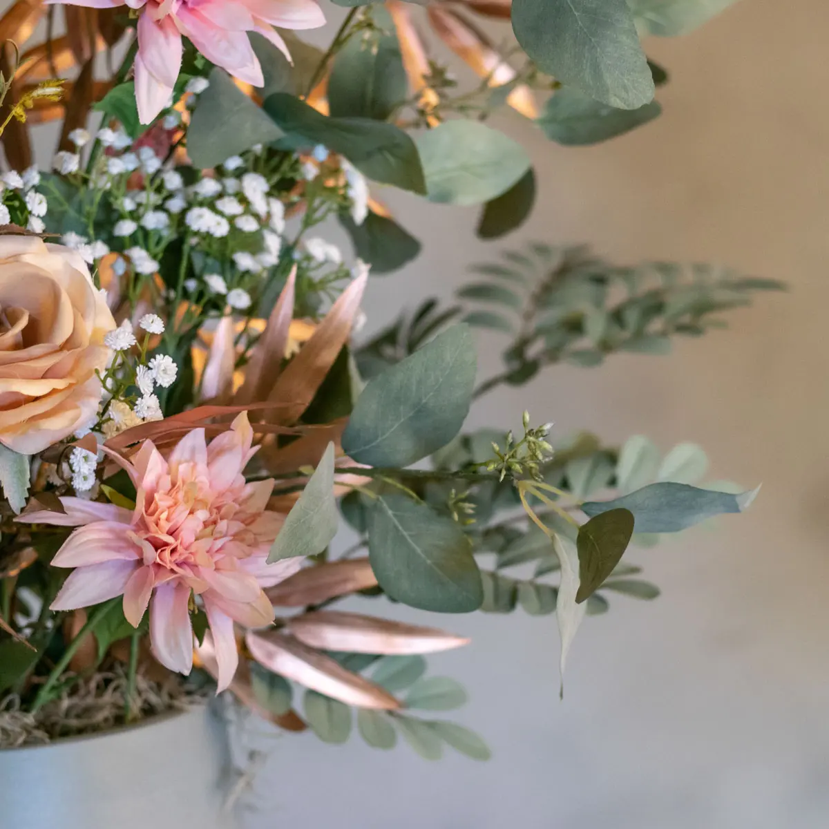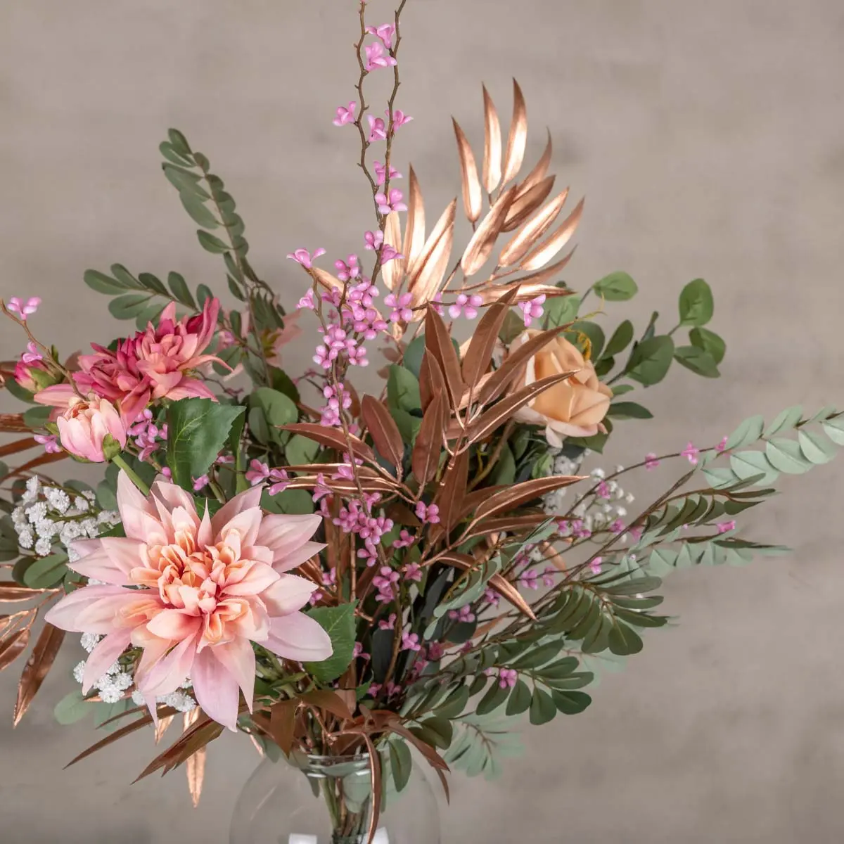 Der künstliche Blumenstrauß Chic kombiniert warme Töne mit luxuriösen Details. Die Mischung aus altrosa Blüten, goldenen Blättern, frischem Grün und dezenten Akzenten in Weiß und Rosa machen diesen Strauß zu einem echten Hingucker. Er strahlt Eleganz und Klasse aus und bringt sofort einen Hauch von Raffinesse in jedes Interieur.