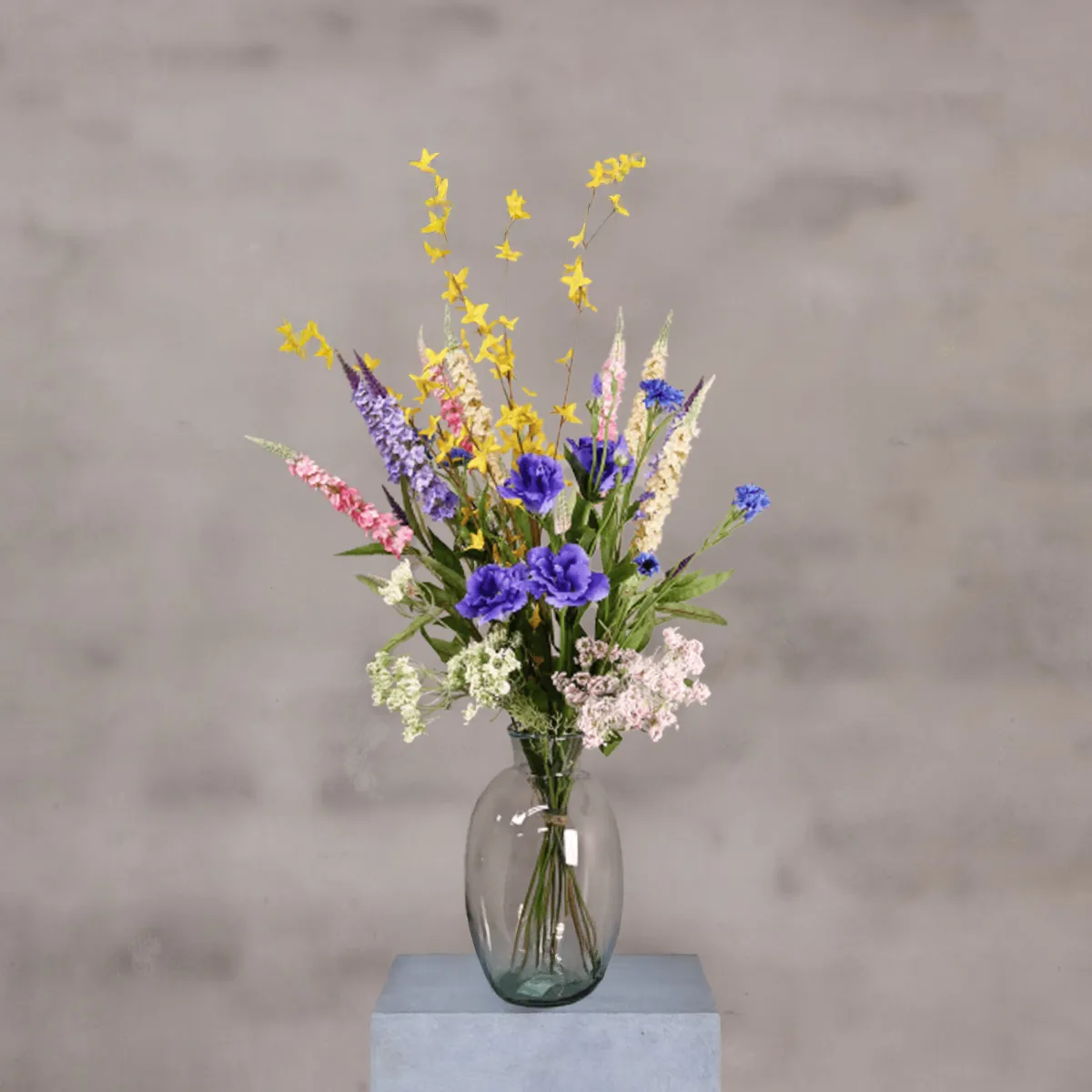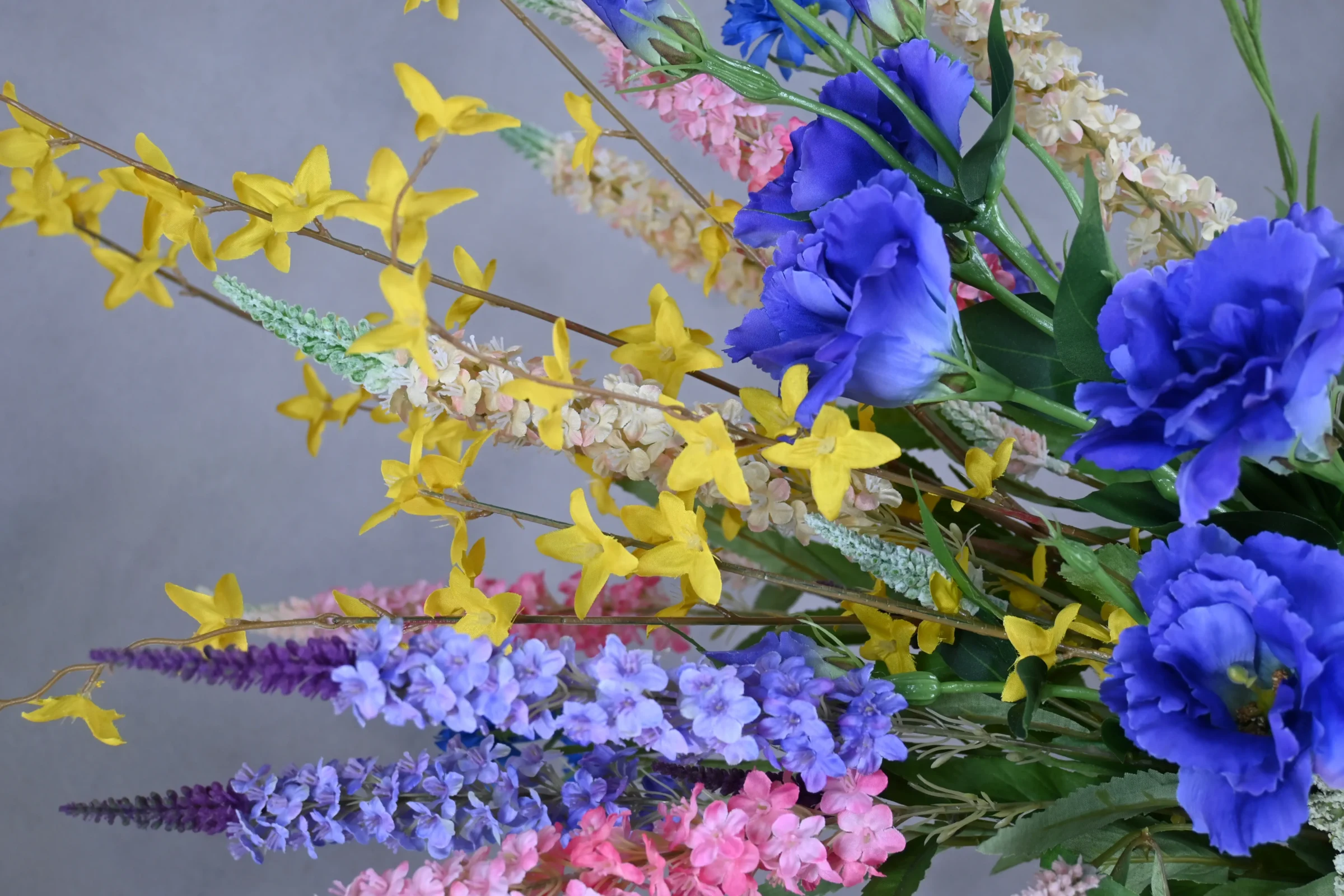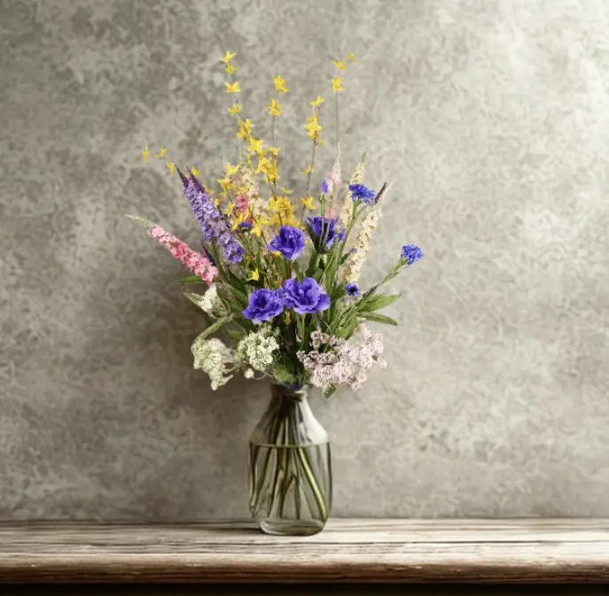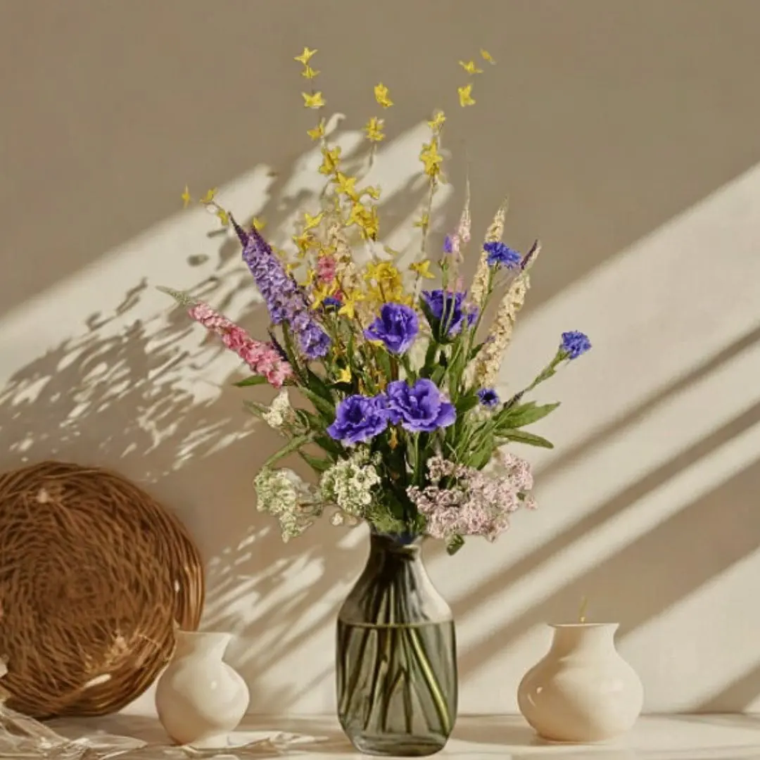 Der künstliche Fantasy-Strauß bringt eine fröhliche und verspielte Atmosphäre in dein Zuhause. Dieser Strauß kombiniert leuchtende Farben wie tiefes Lila, sonniges Gelb, zartes Rosa und frisches Grün. Die sorgfältig ausgewählte Variation der Blumenarten und -höhen macht ihn zu einem echten Hingucker, der natürlich aussieht und einen dynamischen Look verleiht.