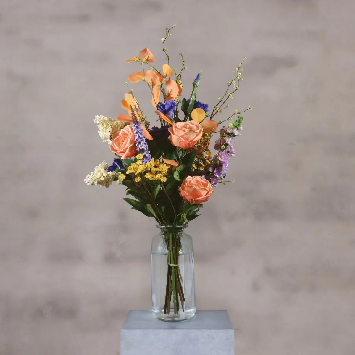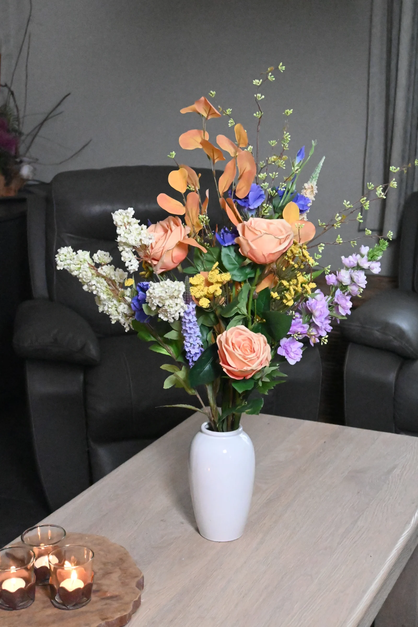 Der künstliche Strauß Farbenpracht ist eine üppige Komposition aus Blumen in Pfirsich, Lila, Blau, Gelb und frischem Grün. Die warmen Rosen in Pfirsichtönen werden mit lebendigen Akzenten und subtilen Zweigen kombiniert und verleihen diesem Strauß einen dynamischen Look. Ein echter Stimmungsmacher, der in moderne, farbenfrohe und kreative Innenräume passt.