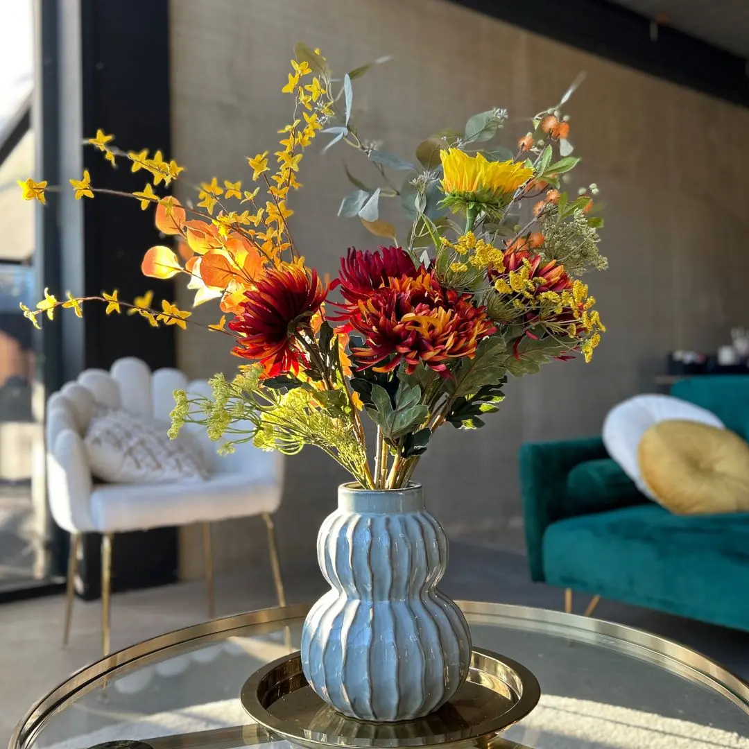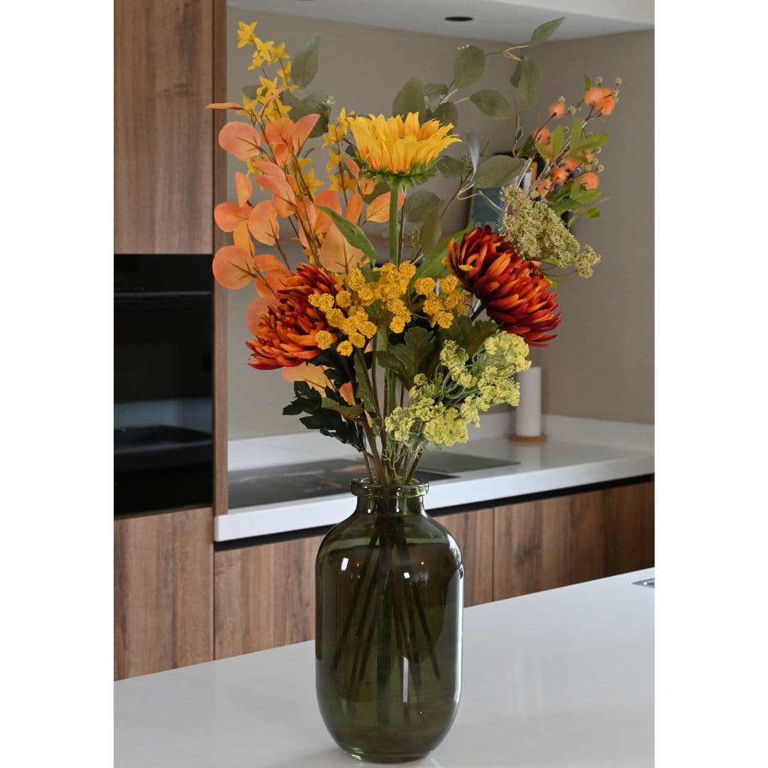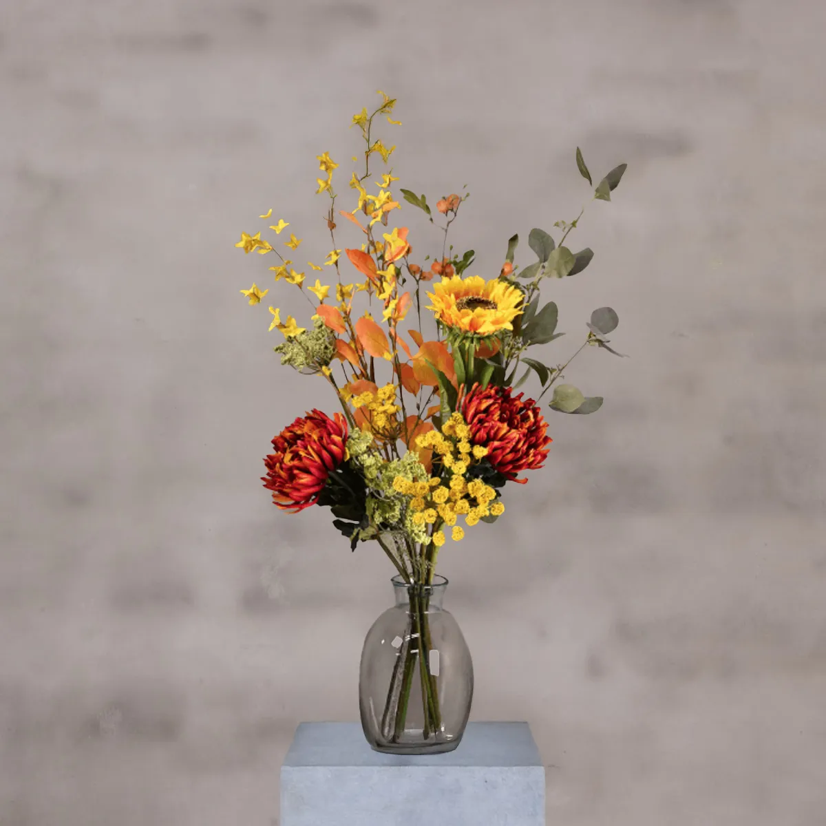 Künstlicher Blumenstrauß Goldener Glanz bringt Wärme und Eleganz in dein Interieur. Die Kombination aus tiefem Orange, Goldgelb, Rostbraun und frischem Grün schafft einen luxuriösen und stimmungsvollen Look. Die Sonnenblume und die warmen Akzentblumen verleihen diesem Strauß einen funkelnden, fast herbstlichen Glanz, der sofort für Atmosphäre sorgt.
