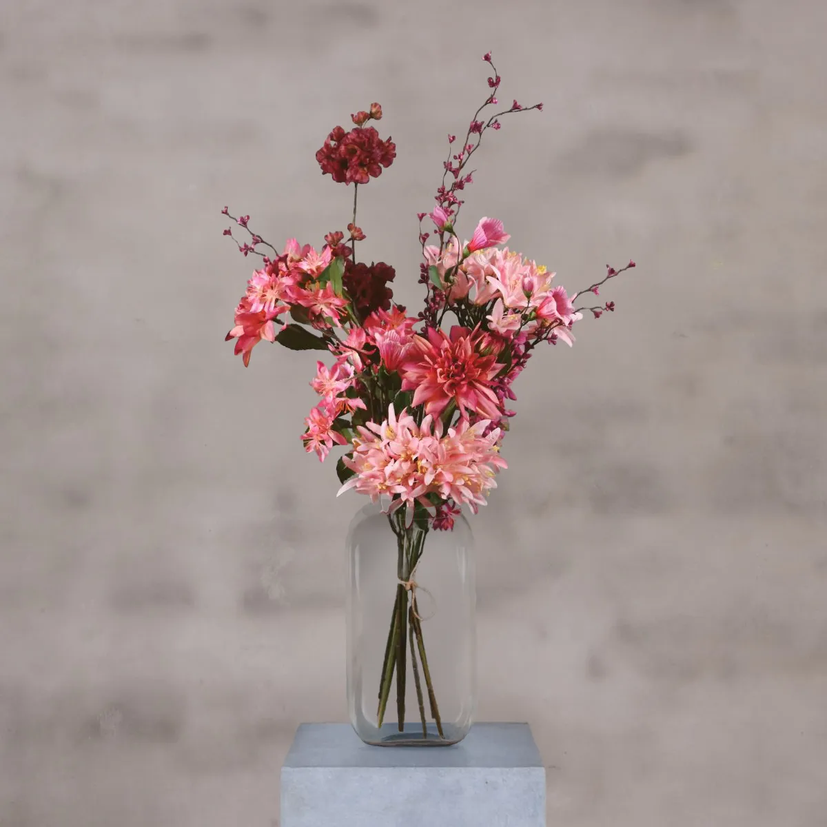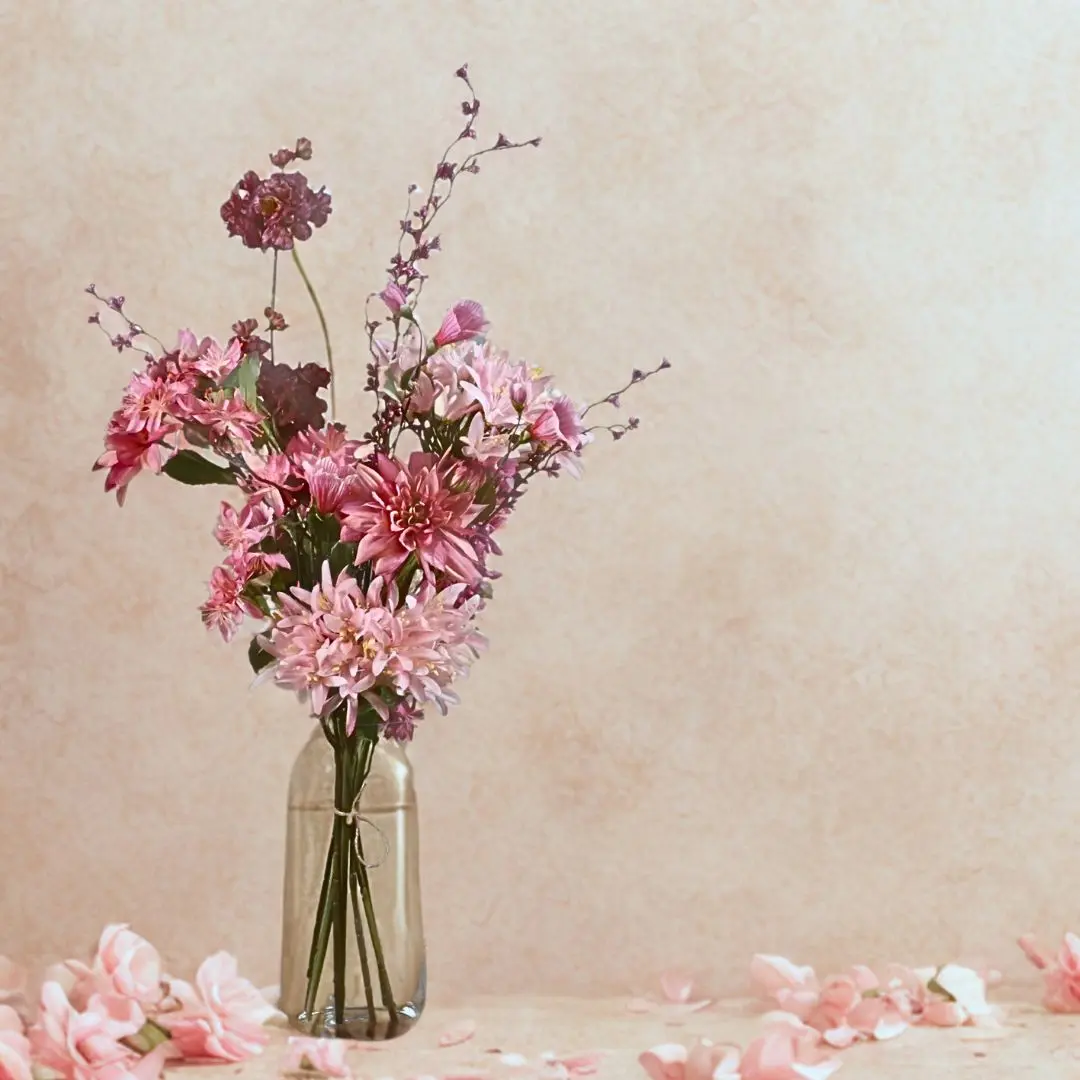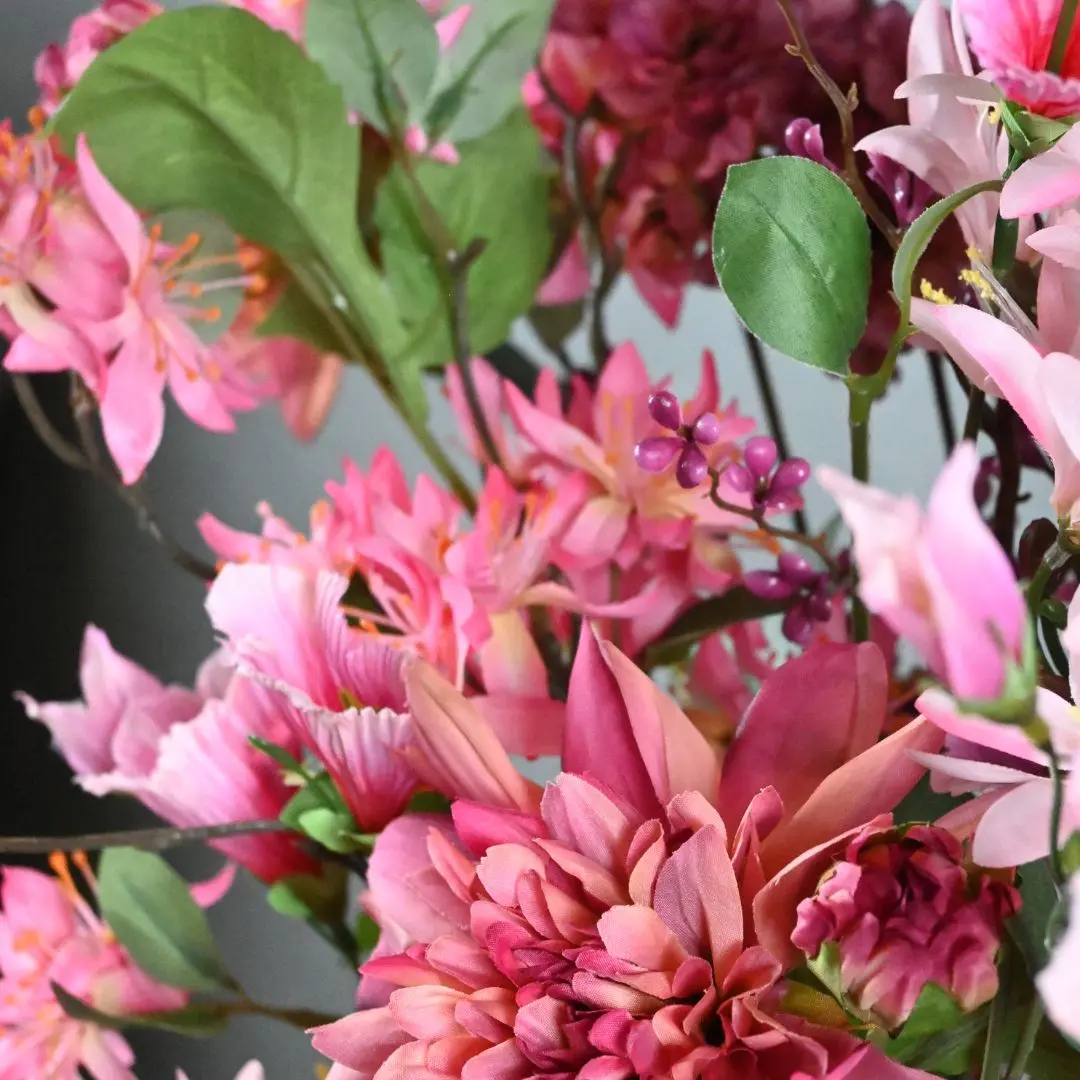 Der künstliche Blumenstrauß Passion strahlt Wärme und Eleganz durch die harmonische Kombination von rosa, fuchsiafarbenen und violetten Blumen aus. Die vollen Blütenköpfe kombiniert mit schlanken Zweigen sorgen für einen raffinierten und verspielten Look. Dank der hochwertigen Verarbeitung sehen die Blumen natürlich aus und du wirst dich jahrelang an einem schönen Strauß erfreuen, der nie verwelkt.