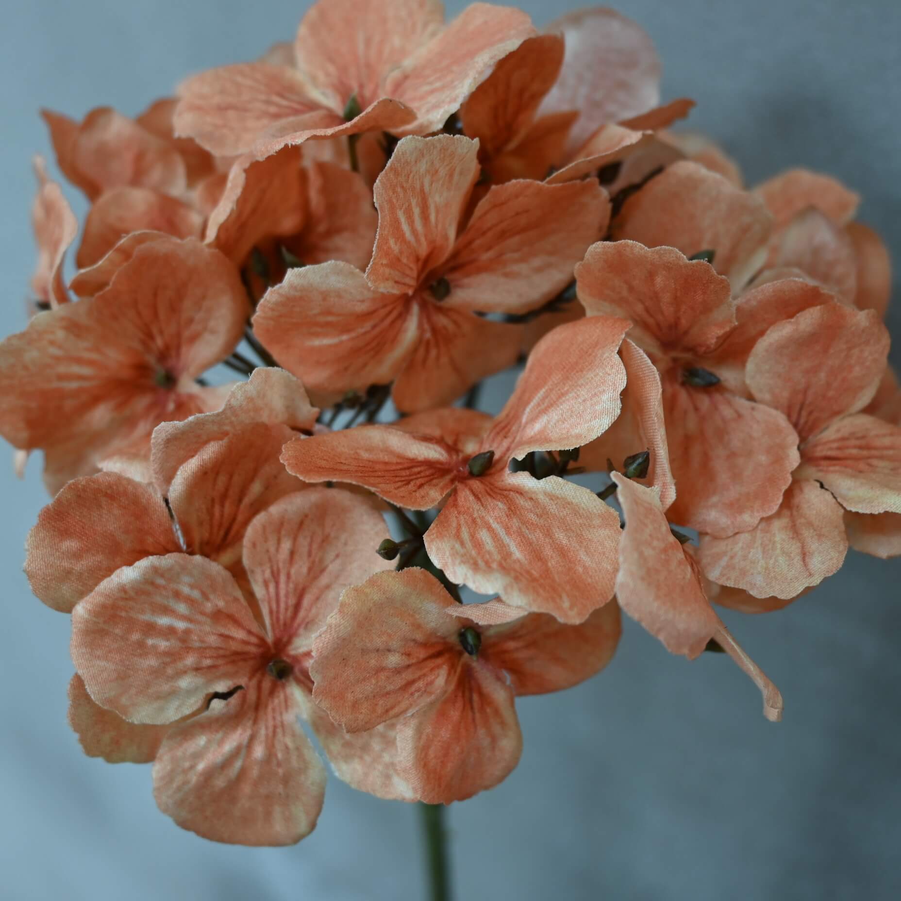 Diese wilde Kunst-Hortensienblüte in einem warmen Orange setzt einen verspielten und natürlichen Akzent in jeder Einrichtung. Mit ihren gefüllten Blüten und der leichten Verzweigung sieht der Zweig lebensecht und stilvoll aus.