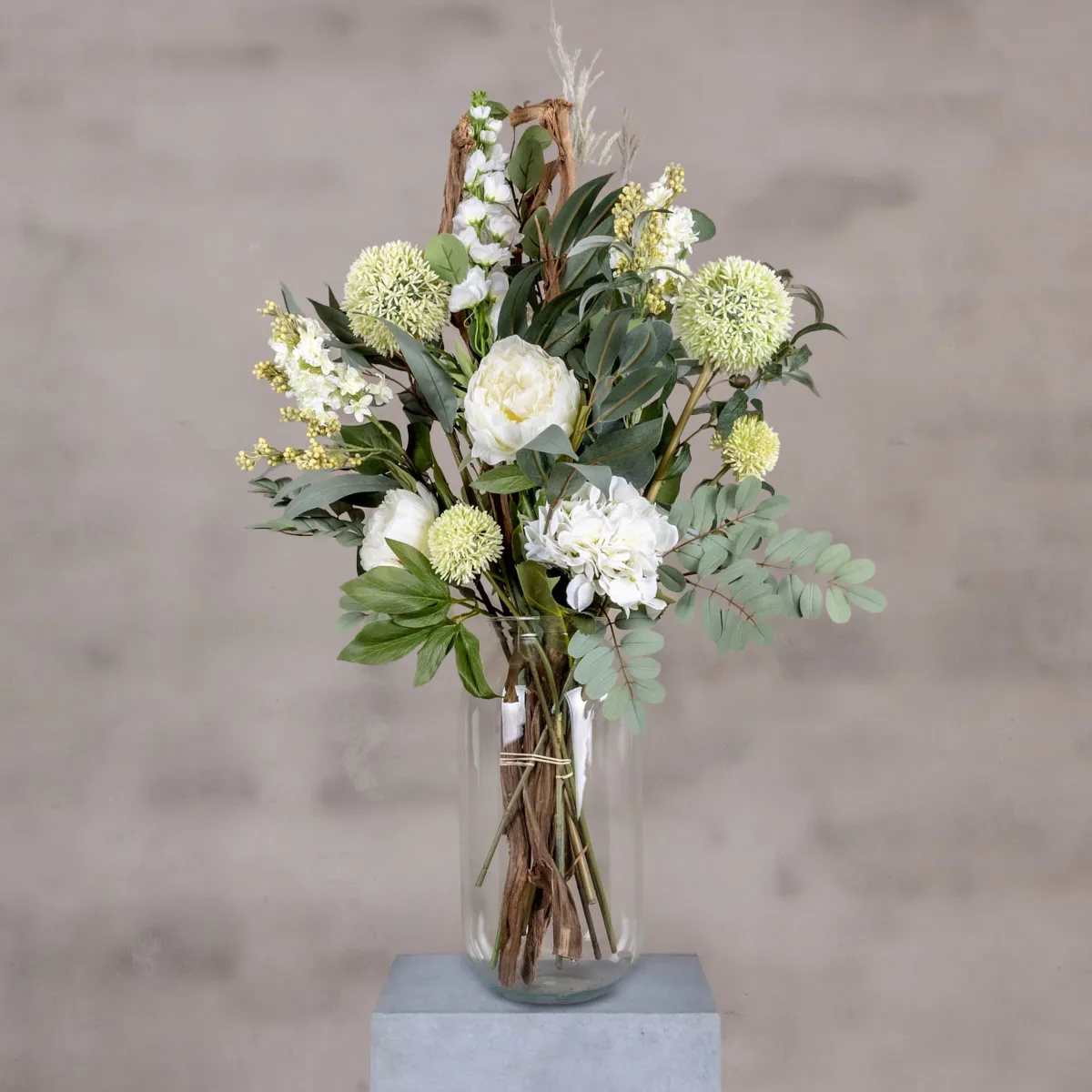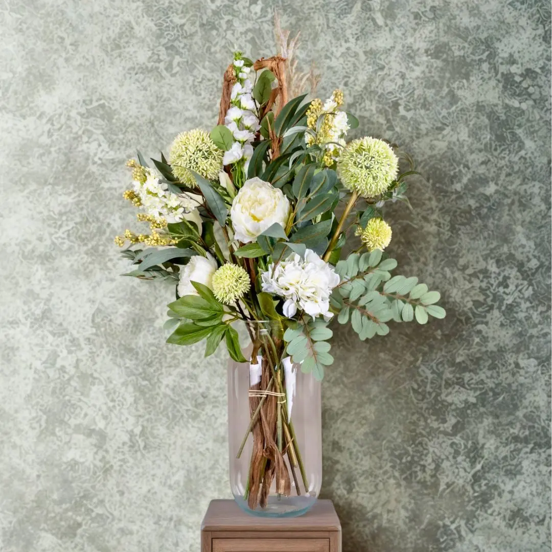 Der künstliche Blumenstrauß Elegance strahlt pure Klasse aus. Die Kombination aus weißen Blumen mit verschiedenen Grüntönen und dezenten Zweigen sorgt für ein frisches und schickes Aussehen. Dank seines natürlichen Finishs sieht dieser Strauß aus wie ein luxuriöser, frischer Strauß, aber ganz ohne Pflege.