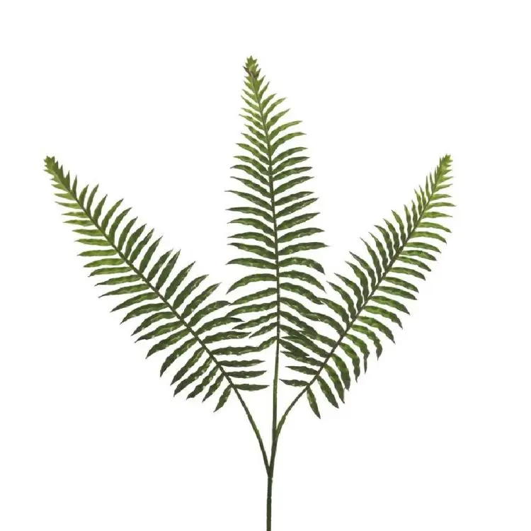 Ein realistisches künstliches Farnblatt mit drei großen, eleganten Blättern in einer natürlichen grünen Farbe. Die grobe Blattstruktur verleiht ihm ein robustes und volles Aussehen, das sich perfekt für Blumenarrangements, größere Vasen oder als einzelner dekorativer Zweig eignet.