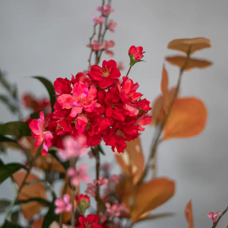Bring Farbe und Wärme in dein Zuhause mit dem Kunstblumenarrangement Nora. Dieses Arrangement kombiniert fuchsiafarbene Blumen mit frischen rosa Akzenten und auffälligen goldgelben Blättern. Die Mischung der Farben sorgt für einen lebendigen und verspielten Look, perfekt für alle, die einen echten Blickfang in ihrem Zuhause wollen.