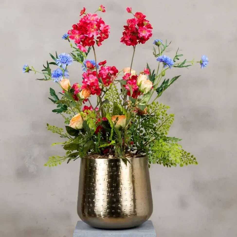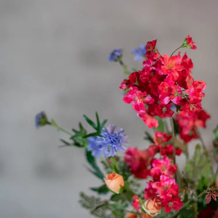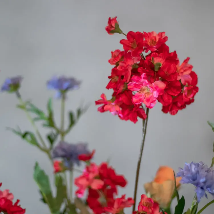 Bring Farbe und Wärme in dein Zuhause mit dem Kunstblumenarrangement Olivia. Dieses Arrangement kombiniert fuchsiafarbene Blumen mit frischen blauen und pfirsichfarbenen Akzenten. Die Mischung der Farben sorgt für einen lebendigen und verspielten Look, perfekt für alle, die einen echten Blickfang in ihrem Zuhause wollen.