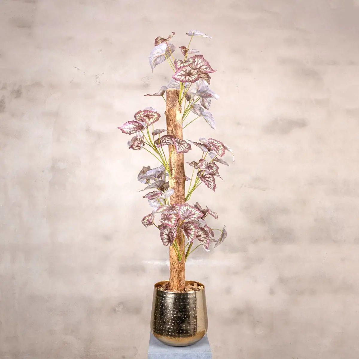 Diese künstliche Blattbegonie von ca. 100 cm bringt sofort Farbe und Lebendigkeit in dein Zuhause. Die Pflanze hat wunderschön geformte Blätter mit einem auffälligen silbergrünen Muster und dezenten roten Akzenten, was sie zu einem echten Hingucker macht. Die schlanke Pflanze windet sich an einem natürlichen Stamm empor und passt stilvoll in jeden Wohnraum.