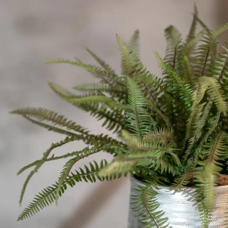 Die Blätter sind naturgetreu mit verschiedenen Grüntönen und einer realistischen Struktur nachgebildet, sodass der Farn kaum von einem echten zu unterscheiden ist. Dank seiner kompakten Größe eignet er sich ideal für einen Beistelltisch, eine Kommode oder die Fensterbank.