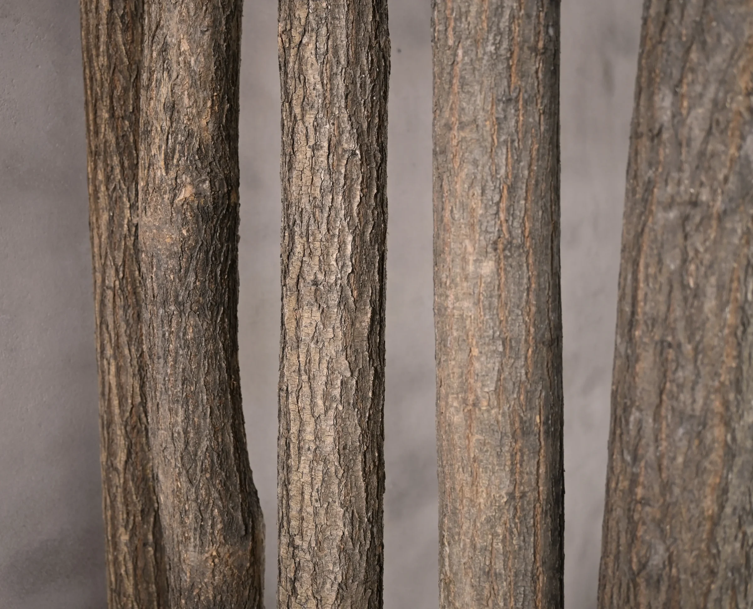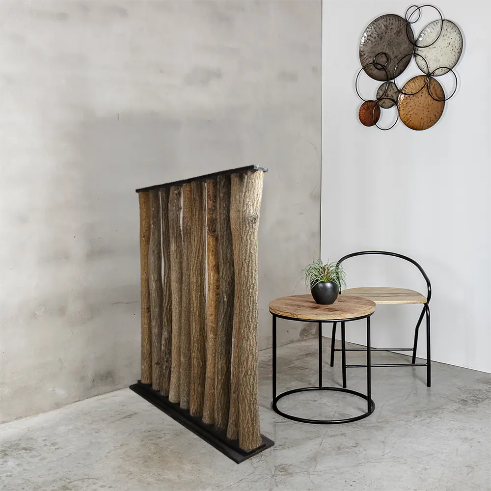 Die Stämme sind fest in einem schwarzen Sockel verankert, der für Stabilität sorgt und einen stilvollen Kontrast zum natürlichen Holz bildet. Diese Kombination macht den Raumteiler sowohl für ländliche Interieurs als auch für moderne Räume geeignet, in denen ein robuster, organischer Blickfang gewünscht ist.