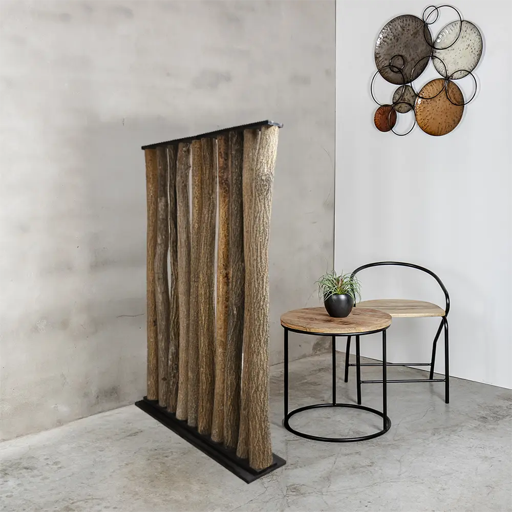 Die Stämme sind fest in einem schwarzen Sockel verankert, der für Stabilität sorgt und einen stilvollen Kontrast zum natürlichen Holz bildet. Diese Kombination macht den Raumteiler sowohl für ländliche Interieurs als auch für moderne Räume geeignet, in denen ein robuster, organischer Blickfang gewünscht ist.