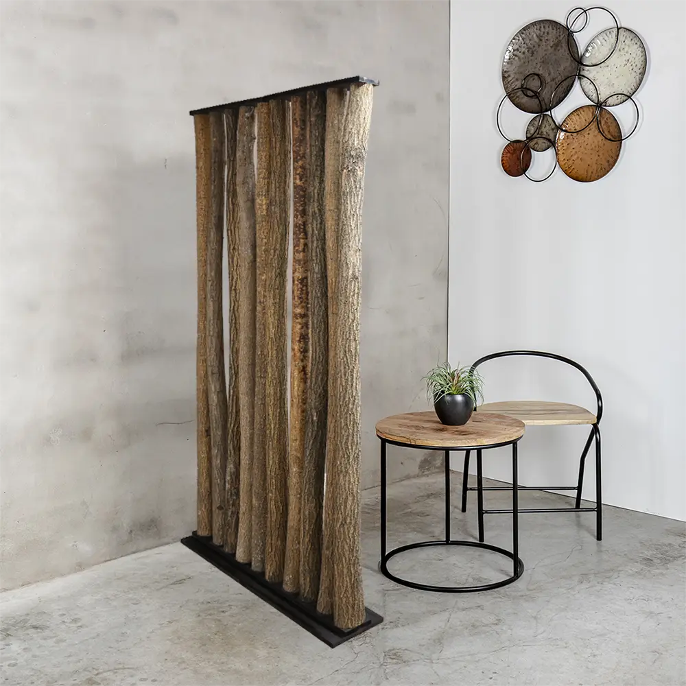 Die Stämme sind fest in einem schwarzen Sockel verankert, der für Stabilität sorgt und einen stilvollen Kontrast zum natürlichen Holz bildet. Diese Kombination macht den Raumteiler sowohl für ländliche Interieurs als auch für moderne Räume geeignet, in denen ein robuster, organischer Blickfang gewünscht ist.