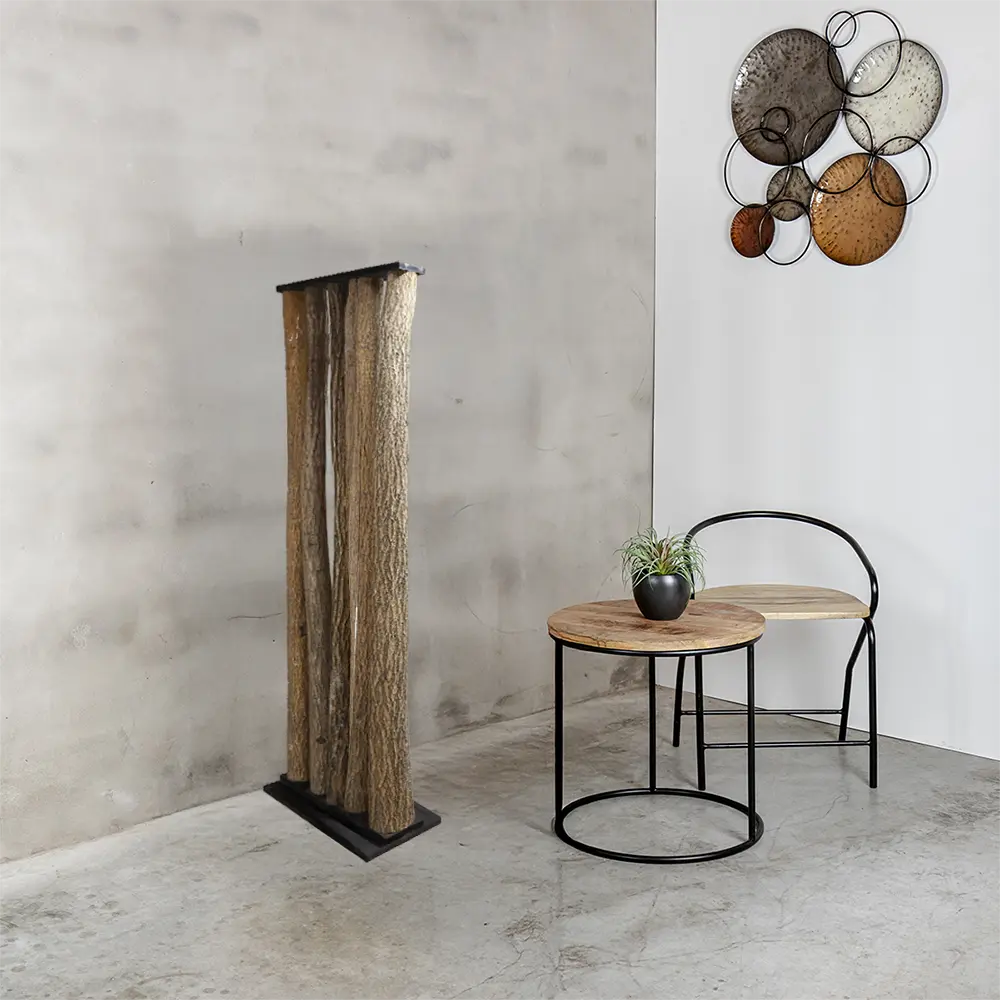 Die Stämme sind fest in einem schwarzen Sockel verankert, der für Stabilität sorgt und einen stilvollen Kontrast zum natürlichen Holz bildet. Diese Kombination macht den Raumteiler sowohl für ländliche Interieurs als auch für moderne Räume geeignet, in denen ein robuster, organischer Blickfang gewünscht ist.