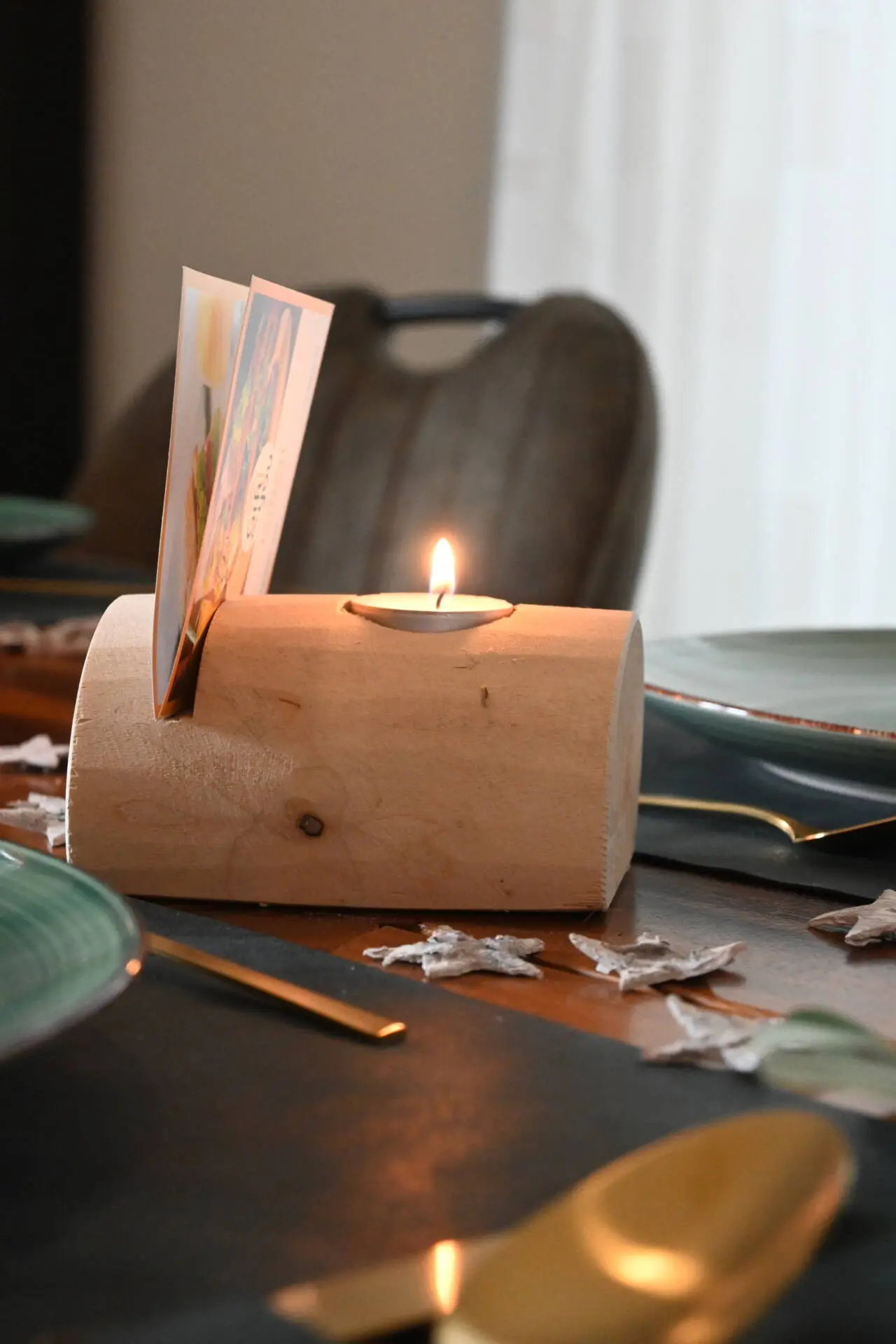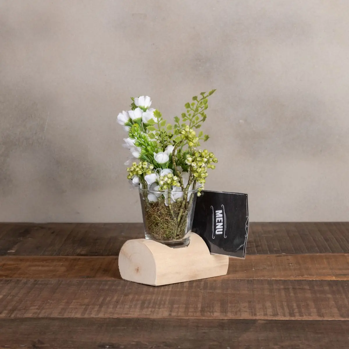 Dieser stilvolle Menükartenhalter Niçoise aus Holz verbindet natürliche Schlichtheit mit praktischer Funktionalität. Aus einem halben Holzstamm gefertigt, bietet er Platz für eine Speisekarte, eine Namenskarte oder ein Foto sowie eine Glasvase für eine Blume oder einen Zweig. Das gibt deinem Tisch sofort ein warmes und einladendes Aussehen.