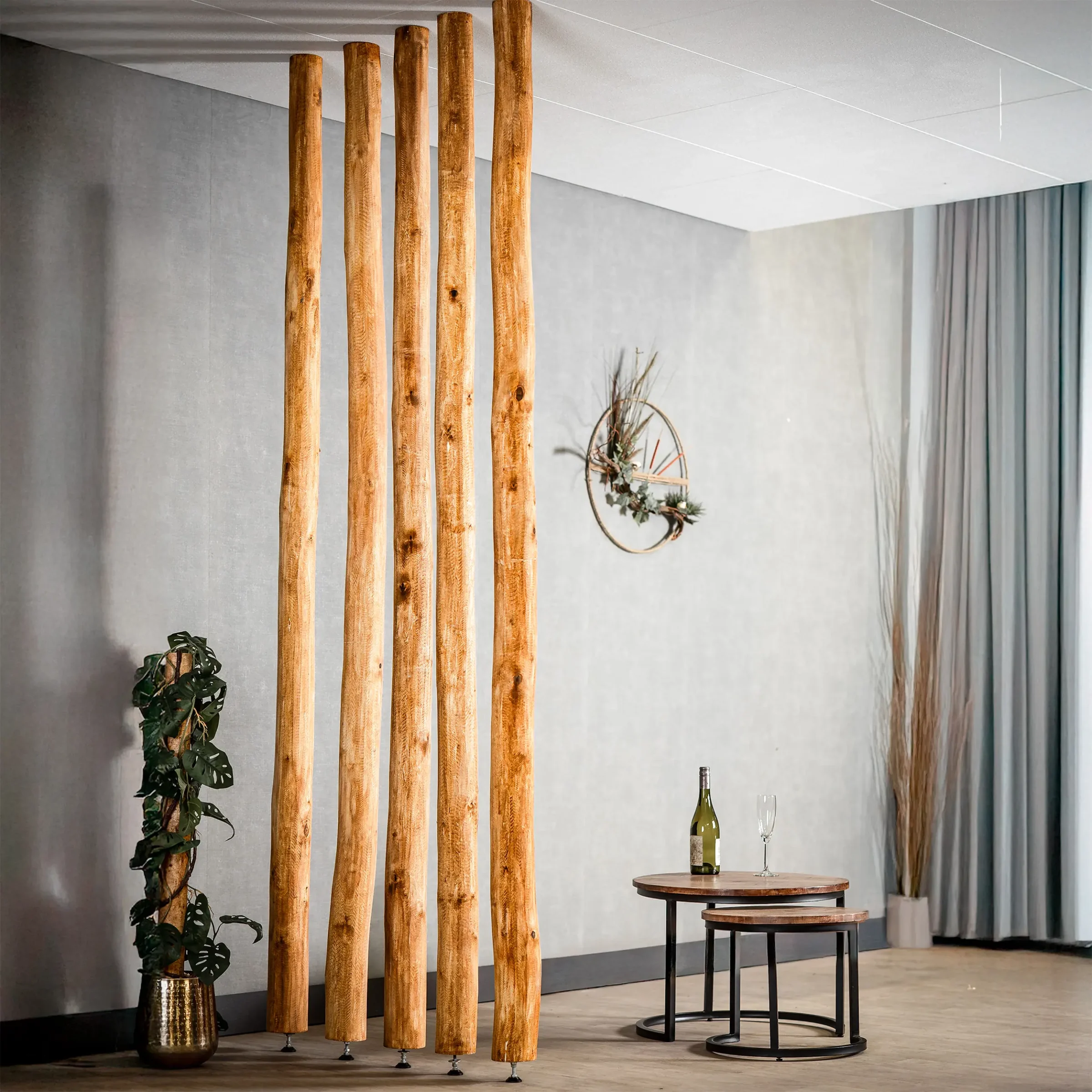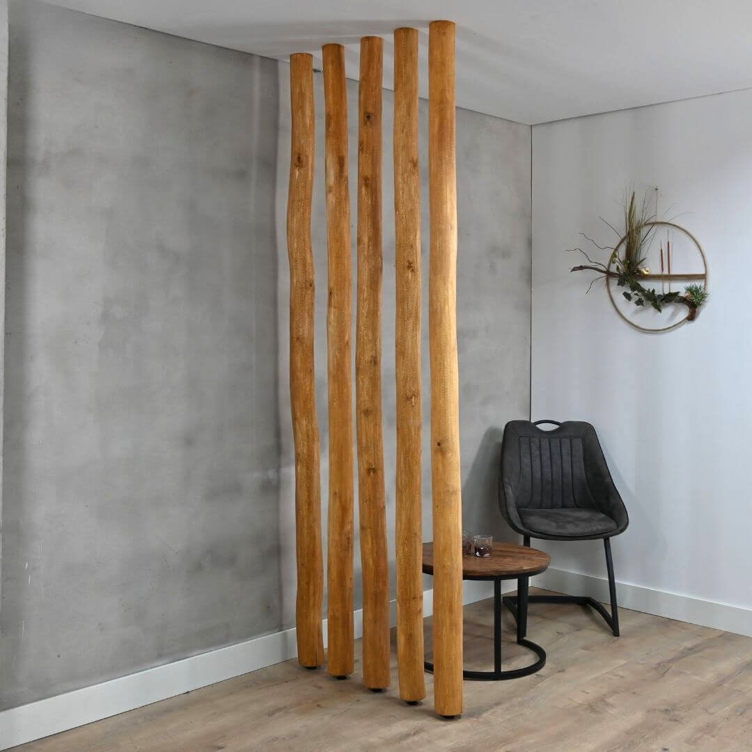 Dank der verstellbaren Stellschraube an der Unterseite lassen sich die Stämme fest zwischen Boden und Decke befestigen – ideal als Raumteiler, Wanddekoration oder Pflanzenstütze. Die Höhe ist verstellbar, sodass sie für fast jede Standarddeckenhöhe geeignet sind.