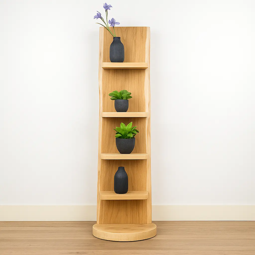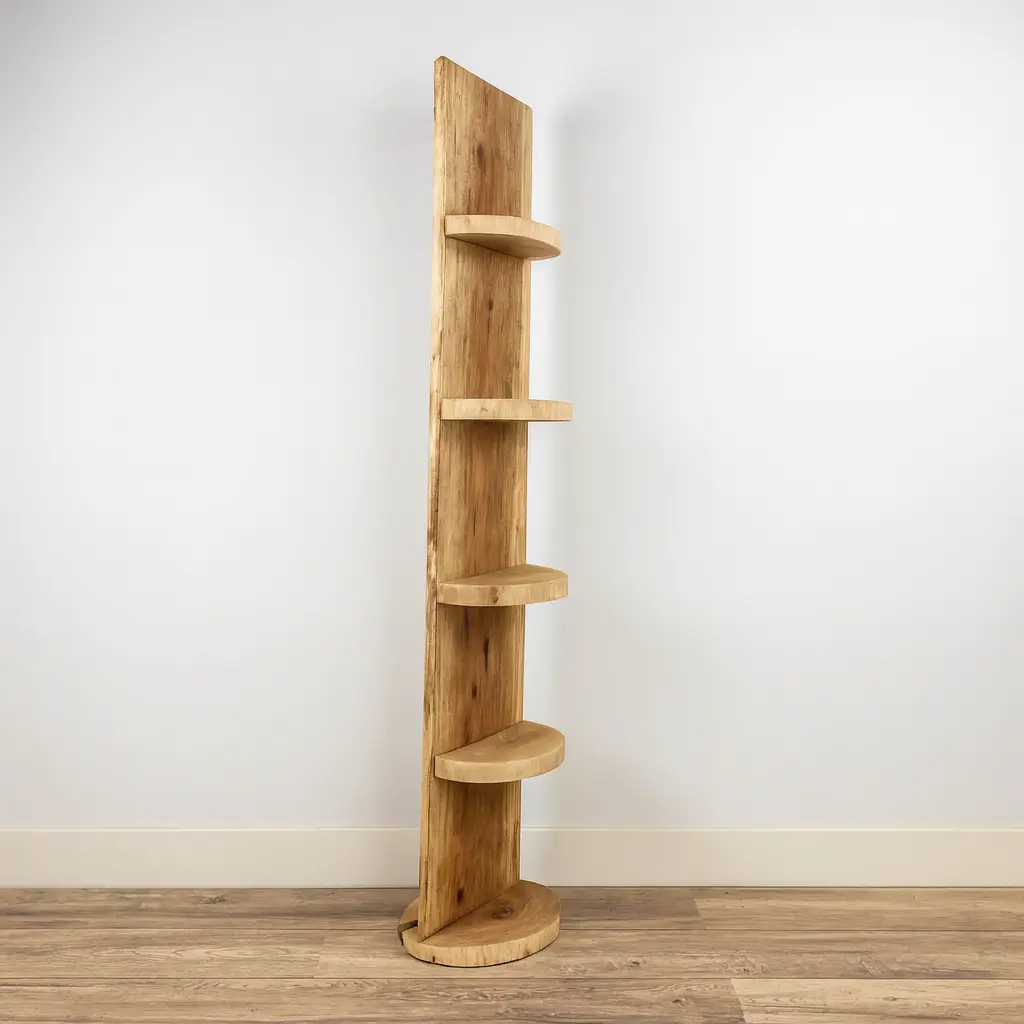 Dank seiner schmalen Form passt dieses Baumstammregal perfekt in kleine Ecken oder als dezenter Blickfang in jedes Interieur.