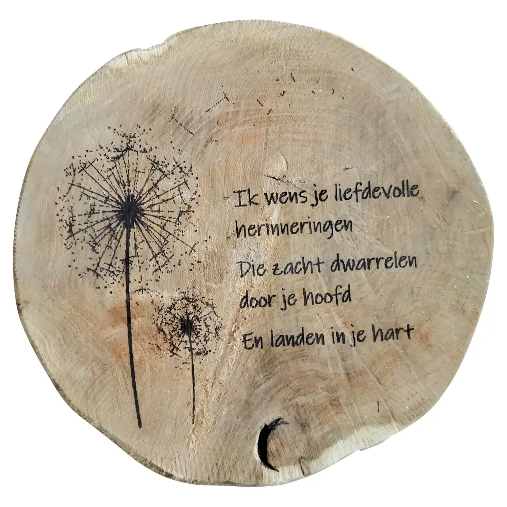 Die Gravur wird sorgfältig in das Holz eingebracht und kann aus Namen, einem Datum, einem Text und/oder einem Symbol bestehen. Dadurch eignet sich die Holzscheibe besonders gut als Gedenktafel für eine Hochzeit, ein Jubiläum, eine Geburt oder einen anderen besonderen Anlass. Die natürliche Holzstruktur und die Jahresringe verleihen der Gravur eine authentische und zeitlose Wirkung.