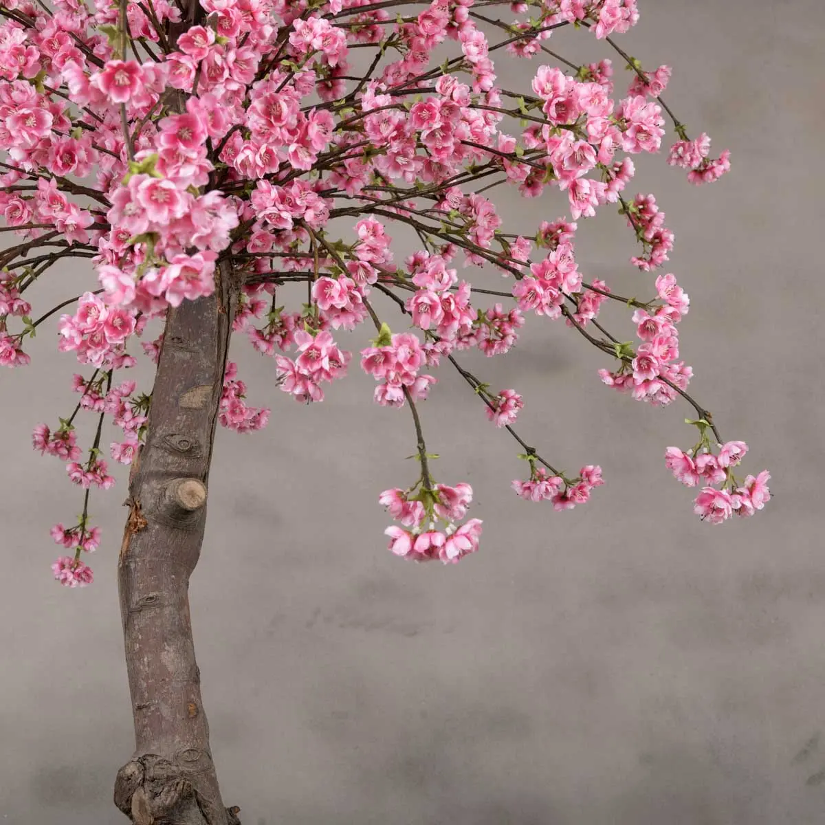Tischblütenbaum Isolde mit leuchtend rosa Blütenzweigen an einem stabilen Weidenstamm, der an einer schwarzen Platte befestigt ist, Höhe 120 cm.
